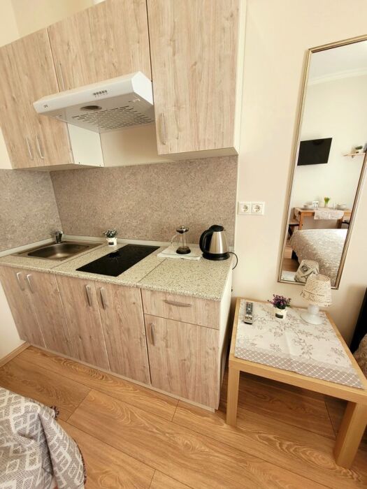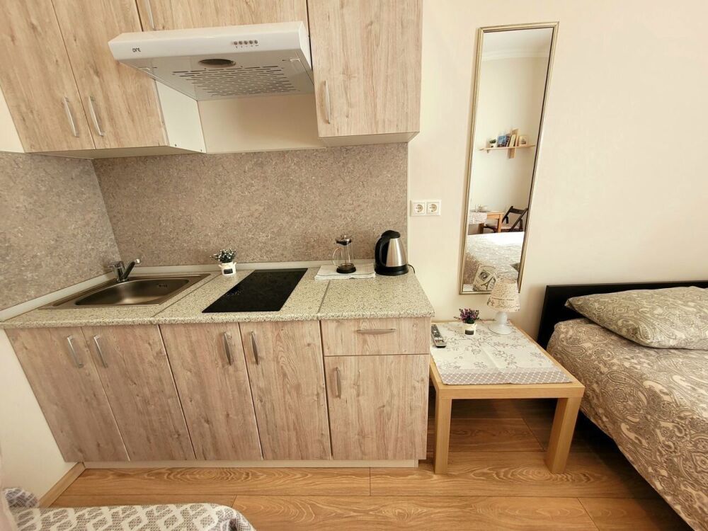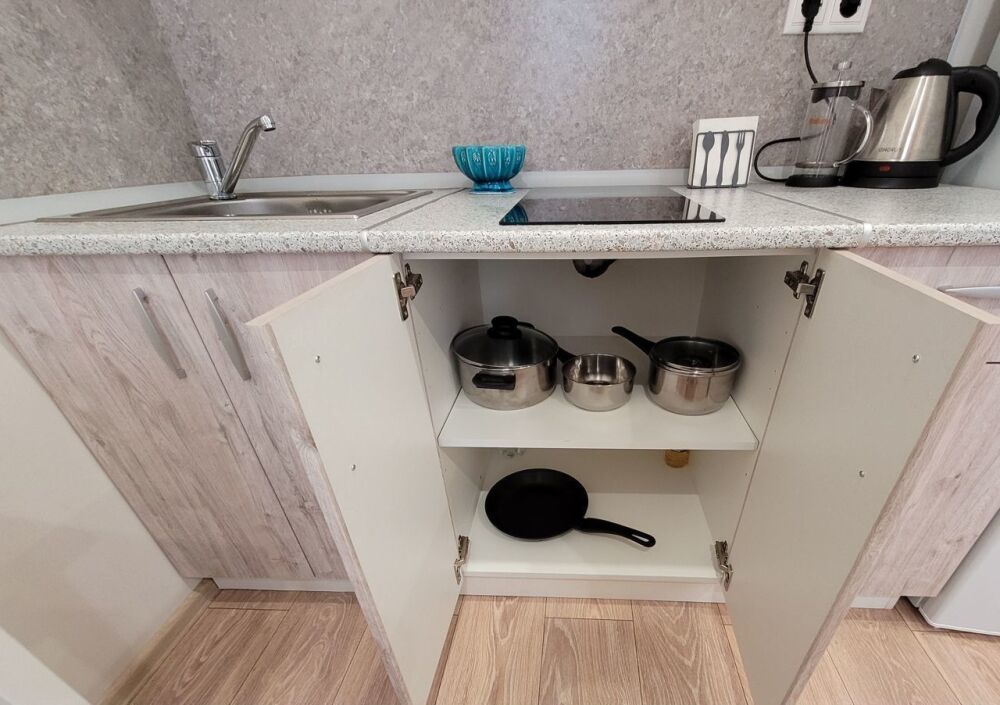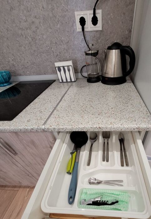 В квартире имеется все необходимое для комфортного проживания. Двуспальная кровать IКЕА и раскладное кресло 80 см, постельные принадлежности, полотенца, средства гигиены, фен, утюг, интернет, телевизор. В кухонной зоне имеется микроволновка, индукционная плита с набором посуды для приготовления, холодильник, столовая посуда и приборы. В квартире имеется стиральная машина.