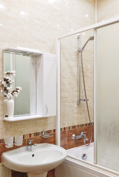 - ванная комната со средствами гигиены и стиральной машиной автомат.