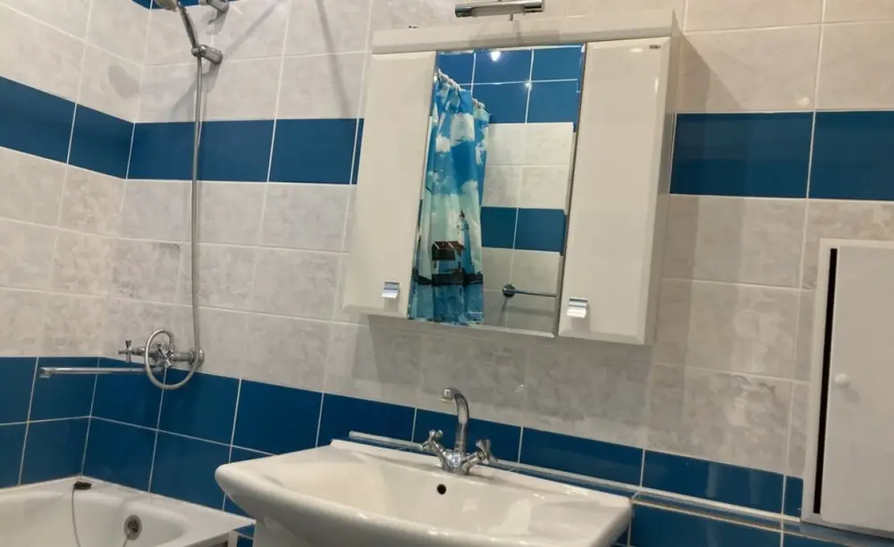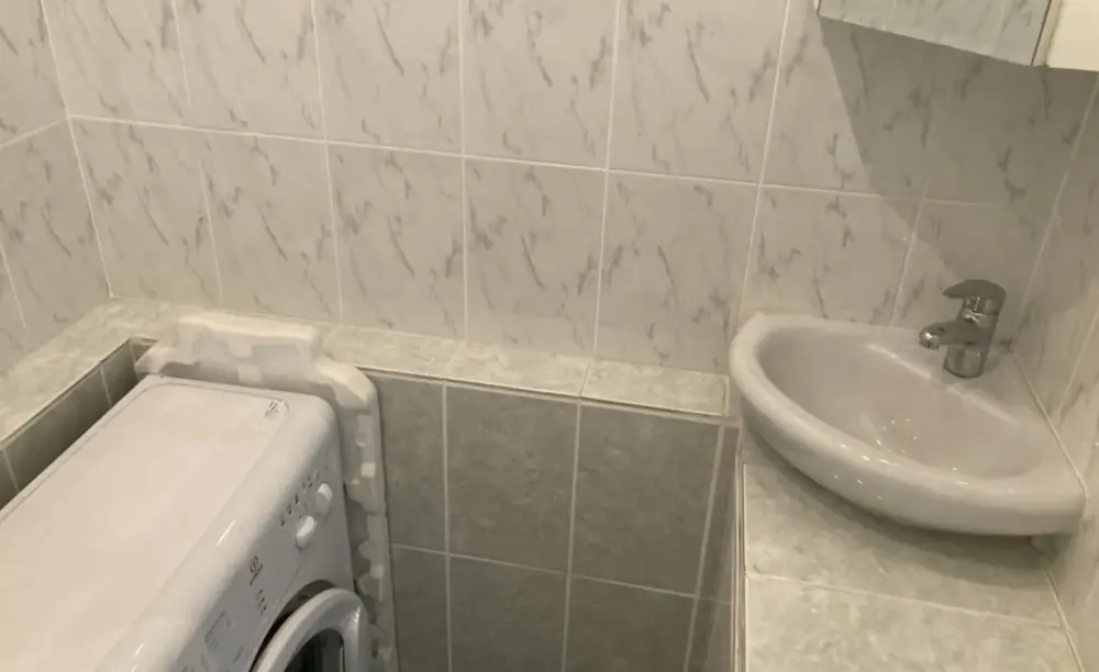 - ванная комната со средствами гигиены и стиральной машиной автомат.