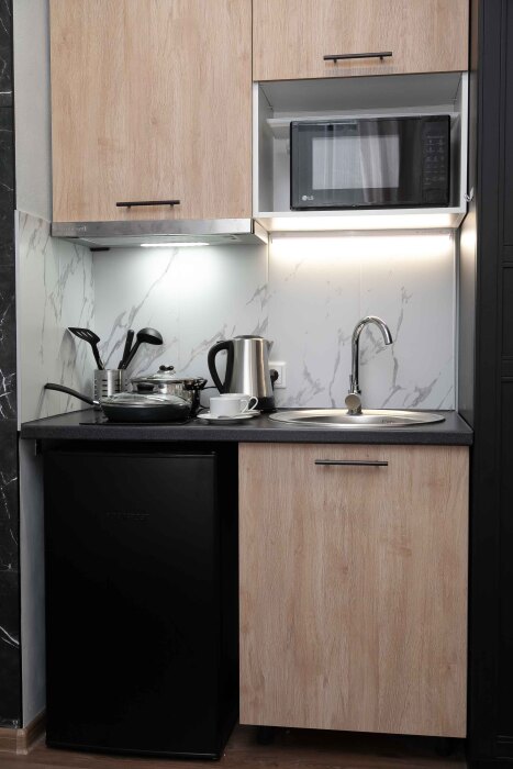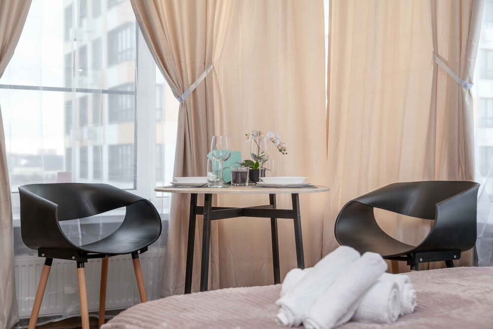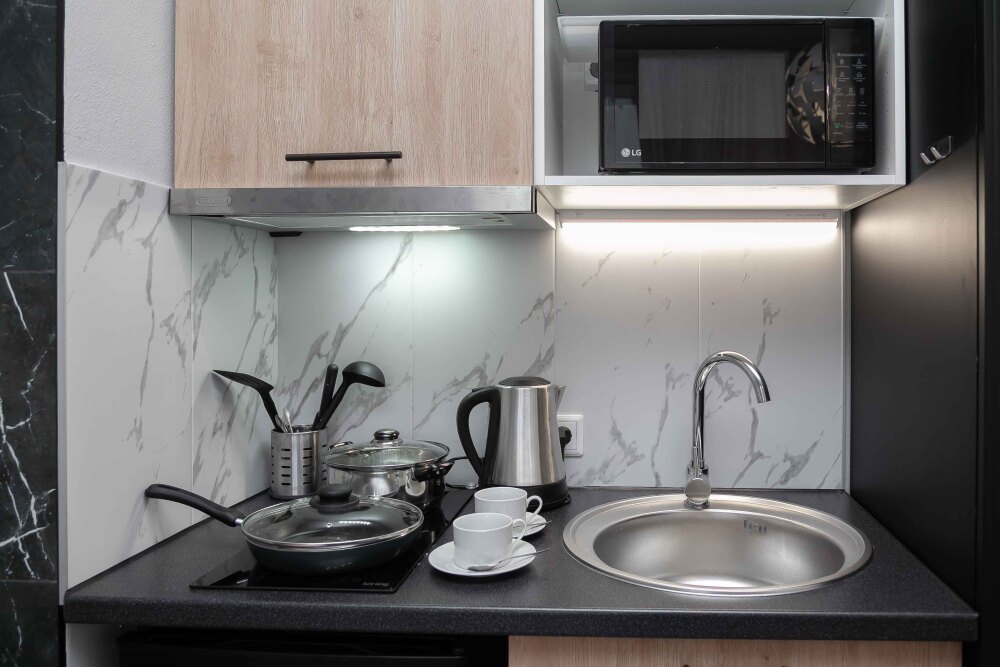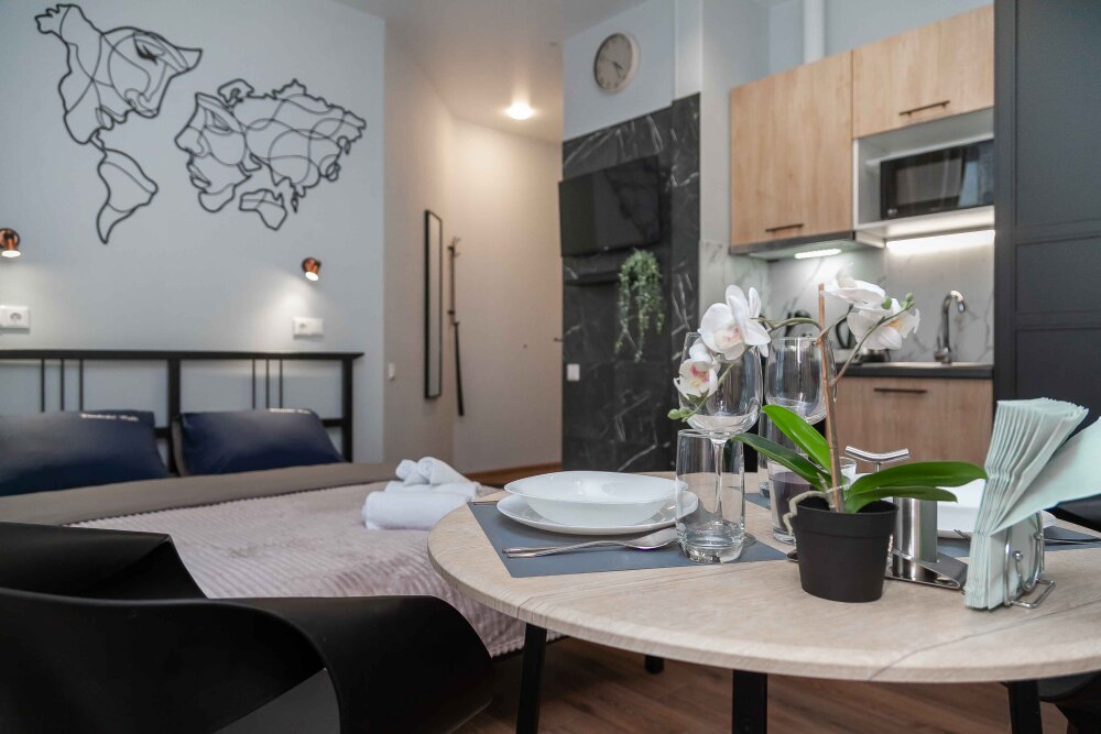 Студия оборудована всем, что нужно для Вашего отдыха: телевизор,чистое постельное белье из прачечной , оборудованная кухня, гладильные принадлежности, фен, стиральная машина, бесплатный Wi-Fi. Вам не придется срочно бежать в магазин за кружками или полотенцем – мы уже позаботились обо всем.