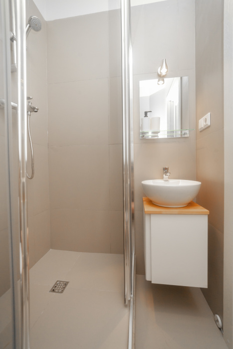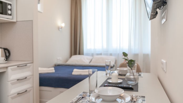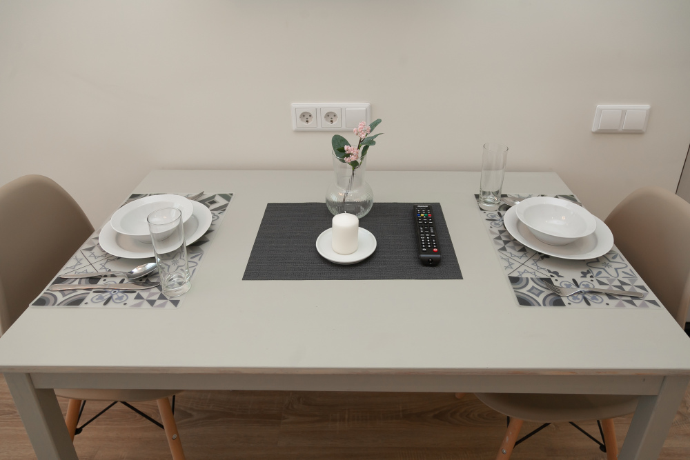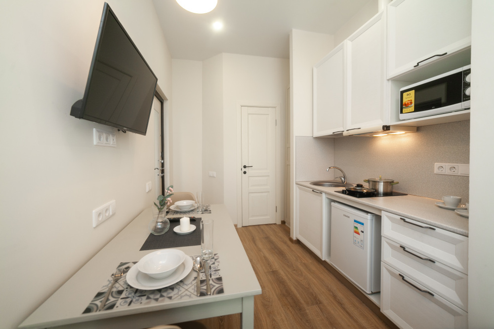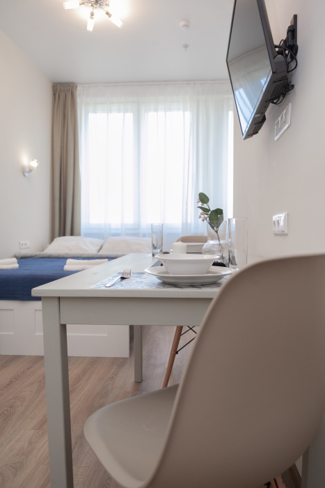 Студия оборудована всем, что нужно для Вашего отдыха: телевизор, постельное белье, средства гигиены, оборудованная кухня, гладильные принадлежности, фен, стиральная машина, бесплатный Wi-Fi. Вам не придется срочно бежать в магазин за кружками или полотенцем – мы уже позаботились обо всем.