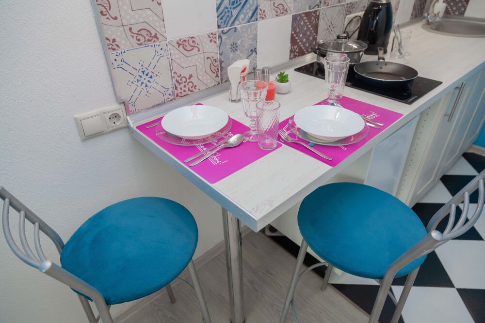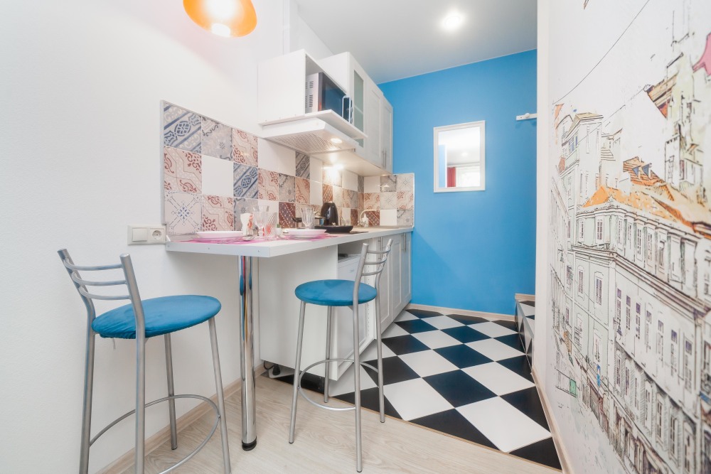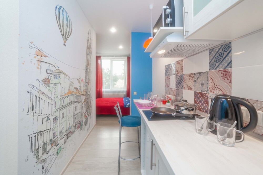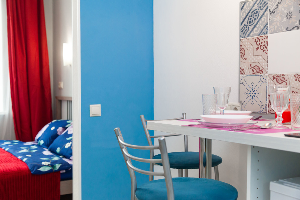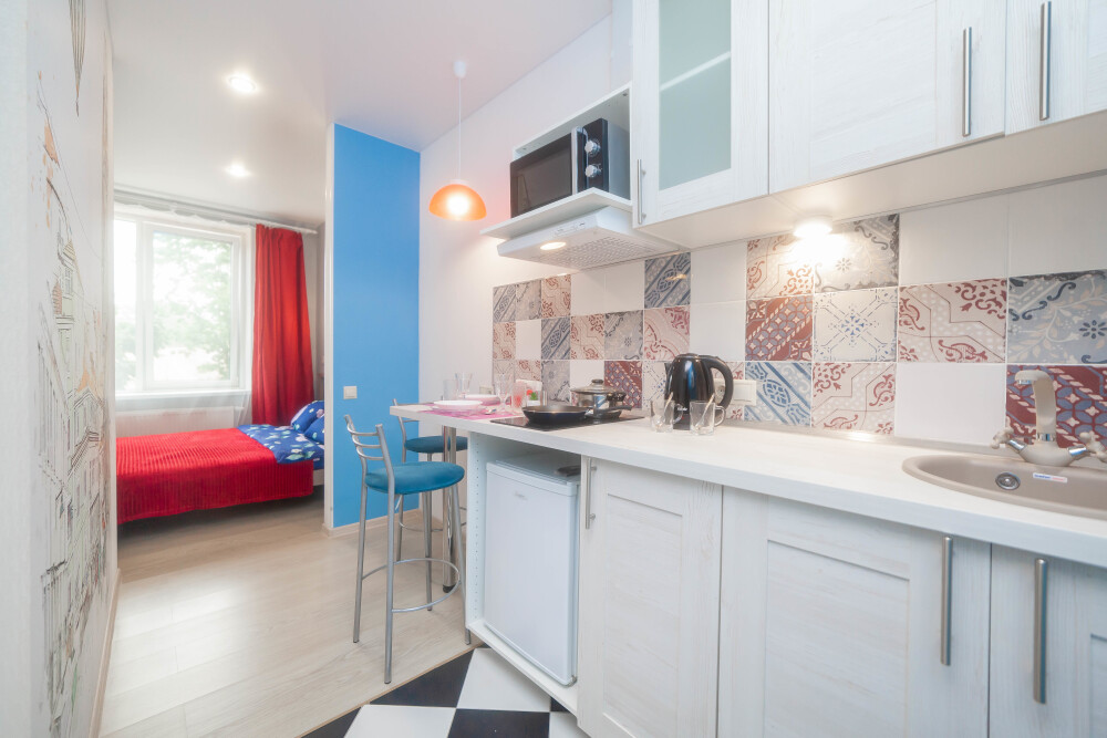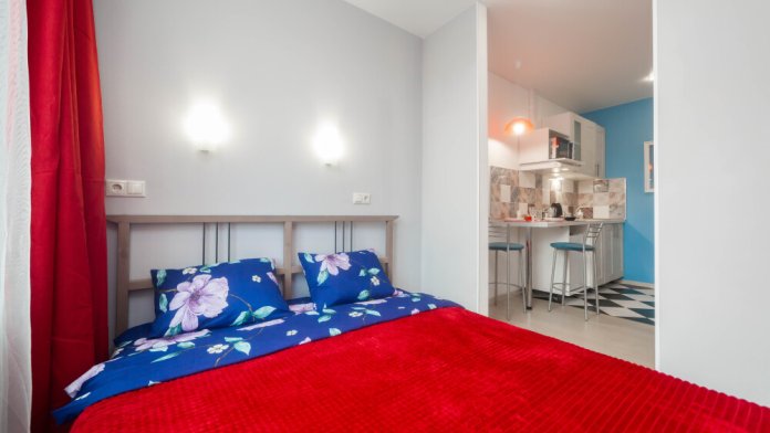 Студия оборудована всем, что нужно для Вашего отдыха: телевизор, постельное белье, средства гигиены, оборудованная кухня, гладильные принадлежности, фен, стиральная машина, бесплатный Wi-Fi. Вам не придется срочно бежать в магазин за кружками или полотенцем – мы уже позаботились обо всем.