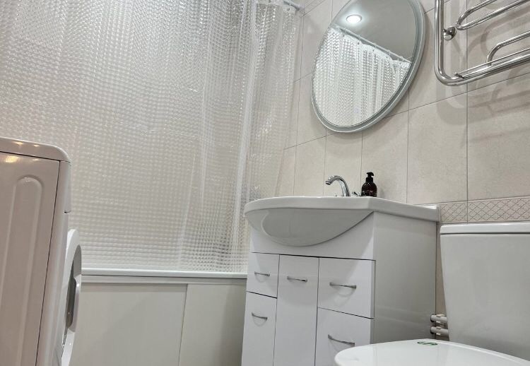 - ванная комната со средствами гигиены и стиральной машиной автомат.