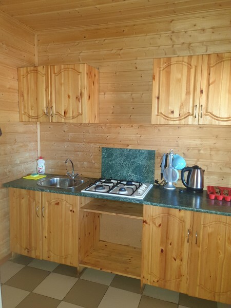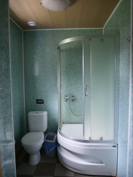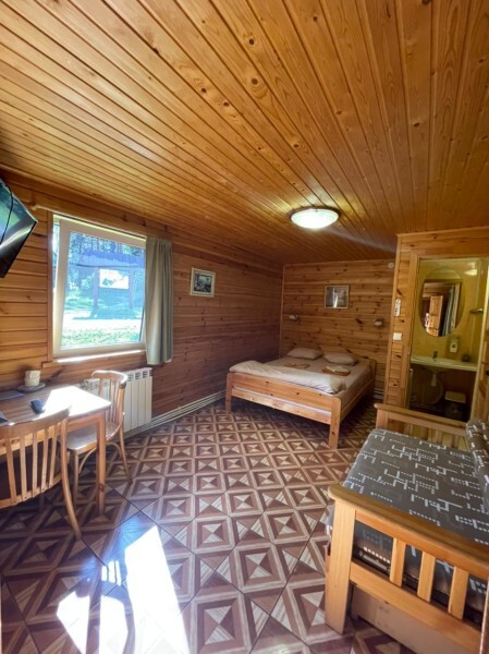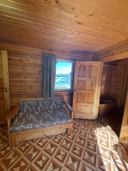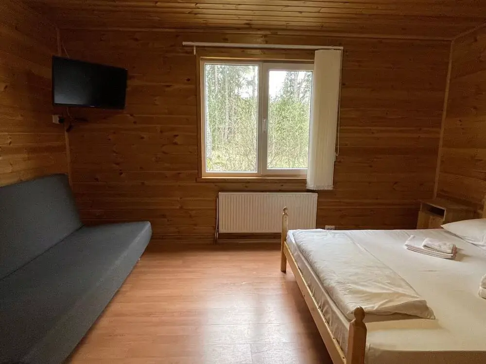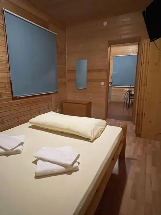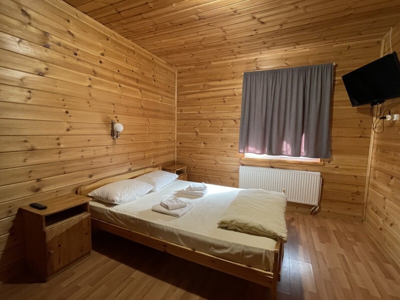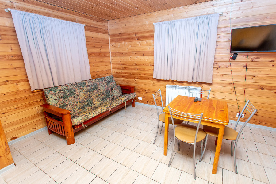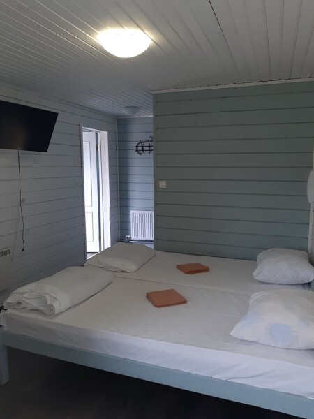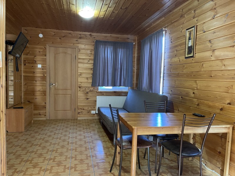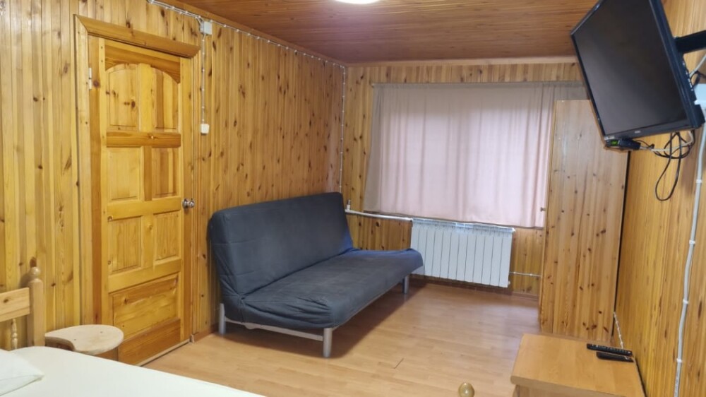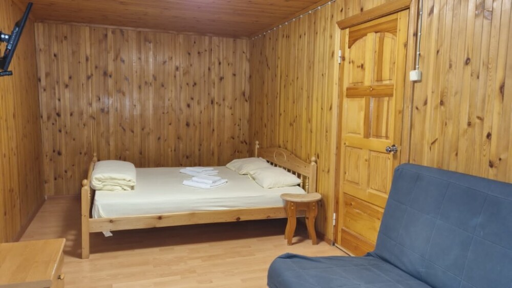 Двуспальная кровать, раскладной диван, обеденный стол, чайные чашки, холодильник, электрочайник, телевизор. Душевая и санузел совмещенные.