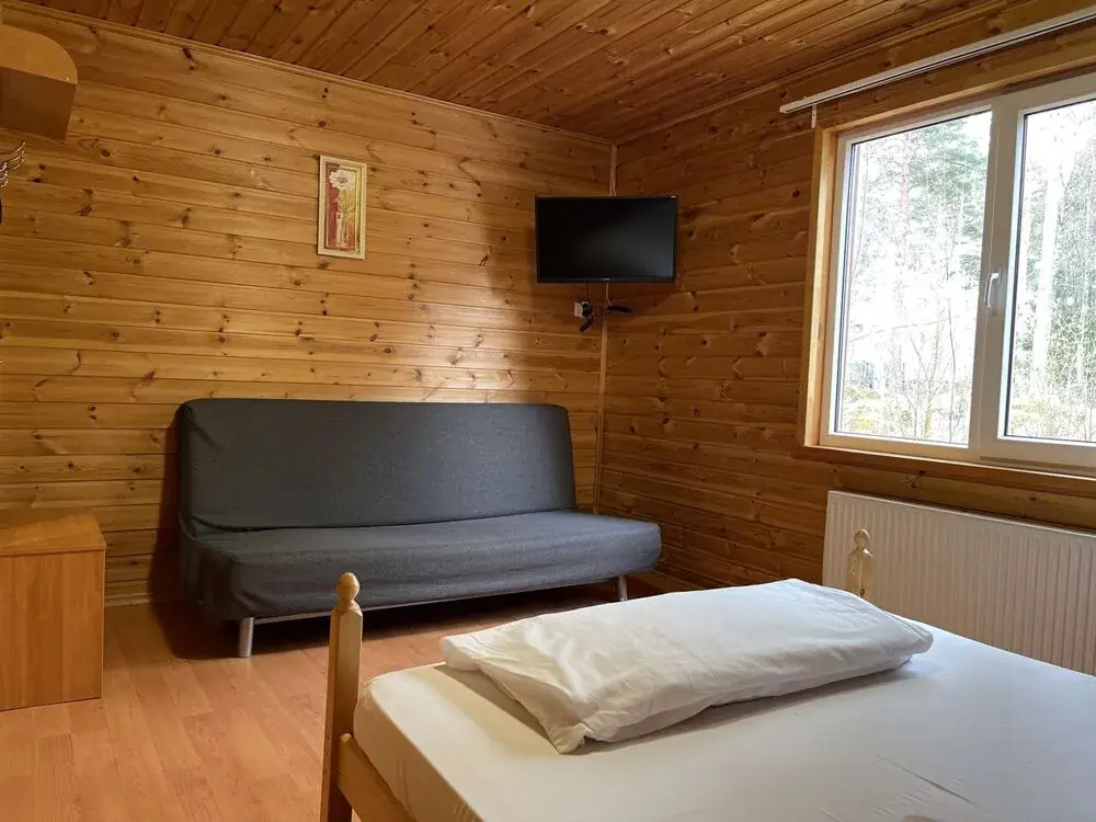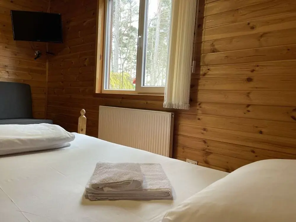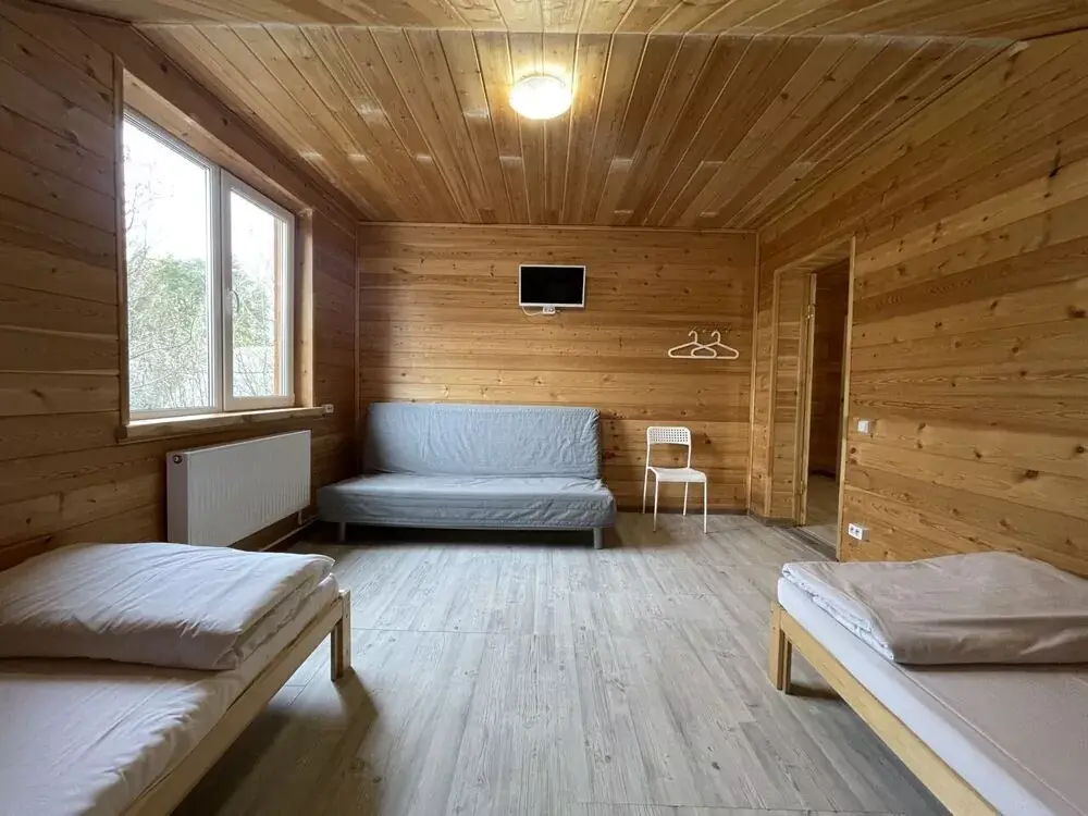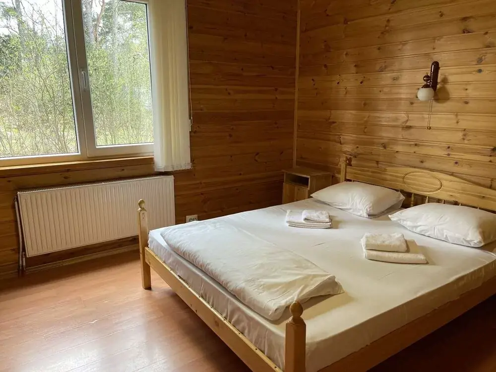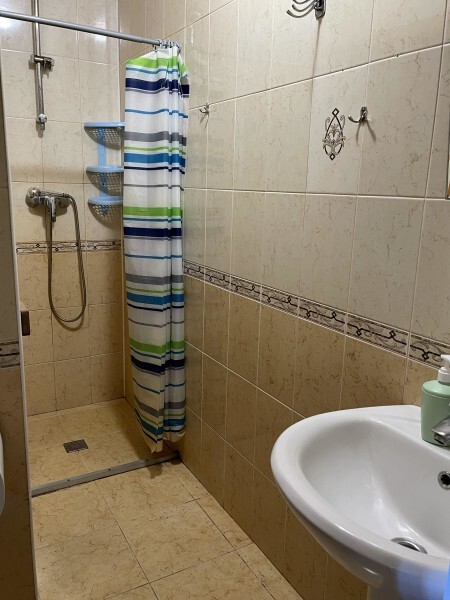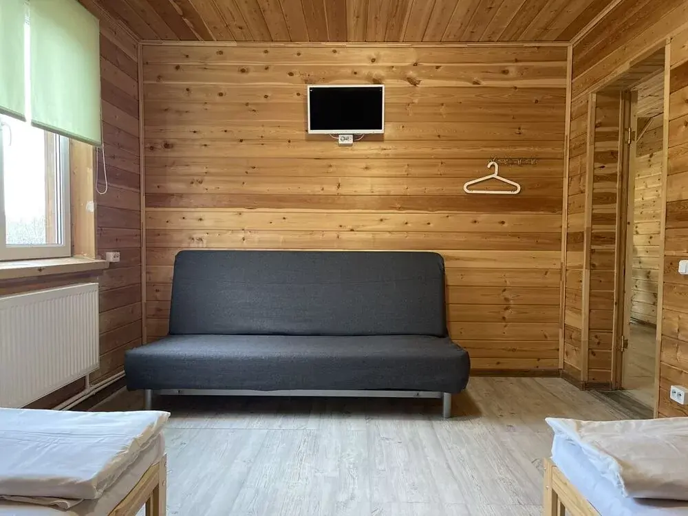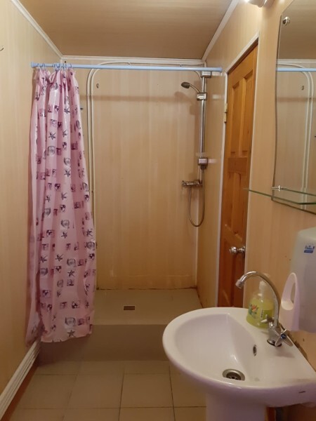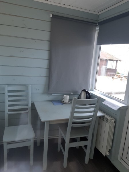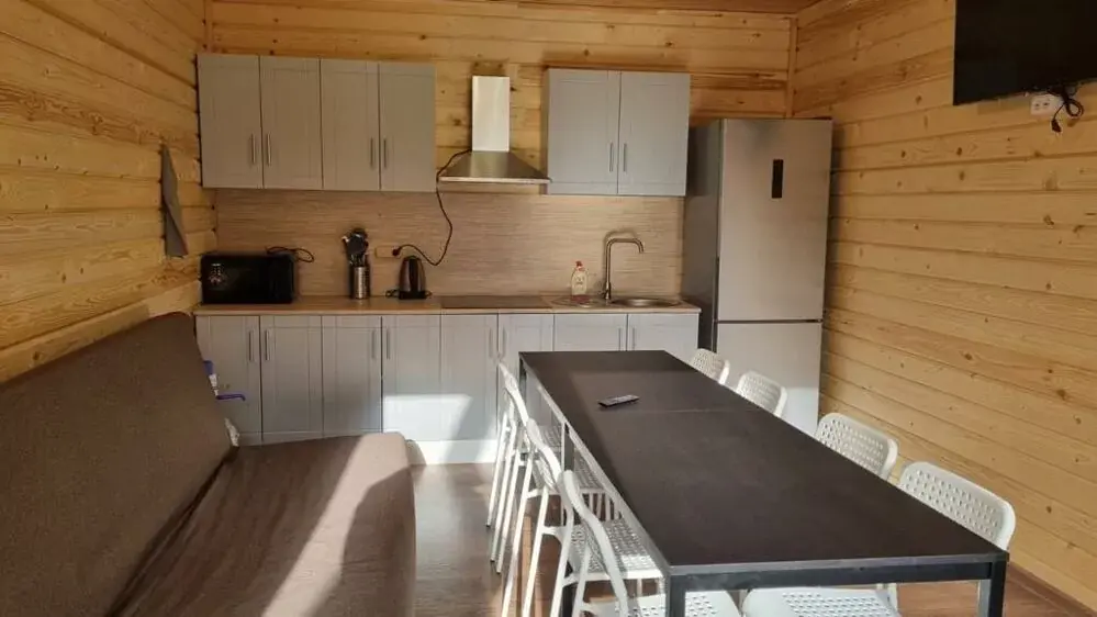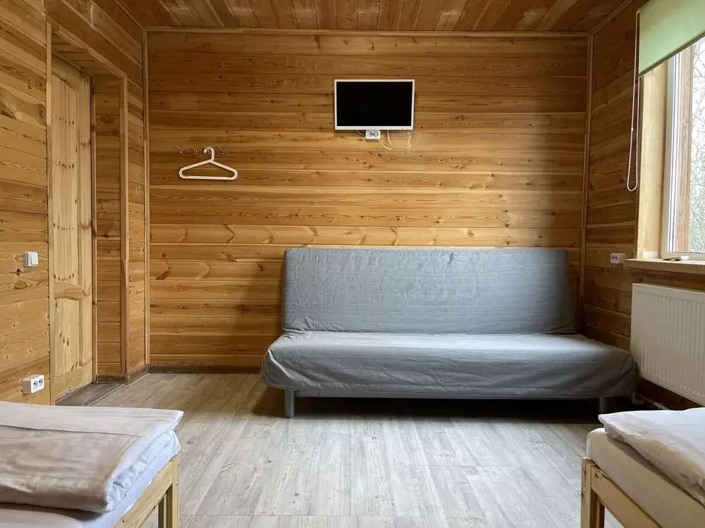Двуспальная кровать, раскладной диван, обеденный стол, чайные чашки, холодильник, электрочайник, телевизор. Душевая и санузел совмещенные.