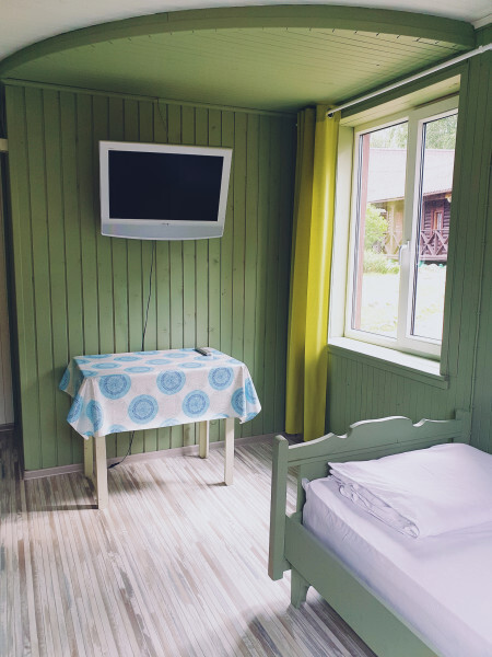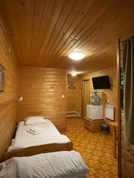В каждом номере: две односпальные кровати (не сдвигаются), стол, холодильник, телевизор, электрочайник, вешалка. В нескольких номерах мансардные окна.