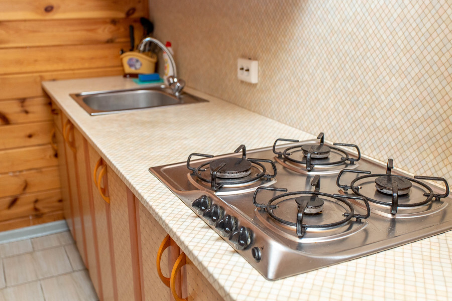 В кухне: холодильник, газовая плита, микроволновая печь, электрочайник, посуда.