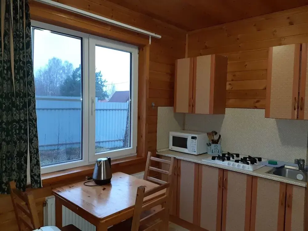 В кухне: холодильник, газовая плита, микроволновая печь, электрочайник, обеденный стол. Имеется вся необходимая посуда.