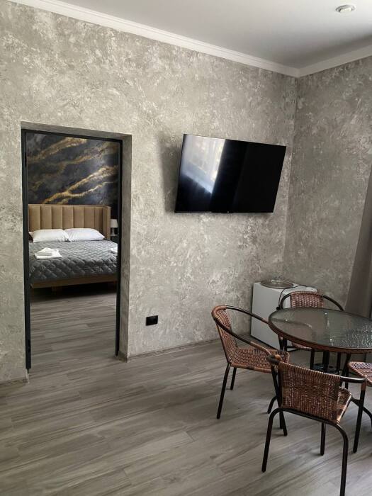Номер с 2-мя изолированными комнатами, в каждой комнате двуспальная кровать, так же гостиная с зоной отдыха и диваном на 2 человека. Есть все необходимым для комфортного отдыха. Возле номера есть зона отдыха со столом и стульями.