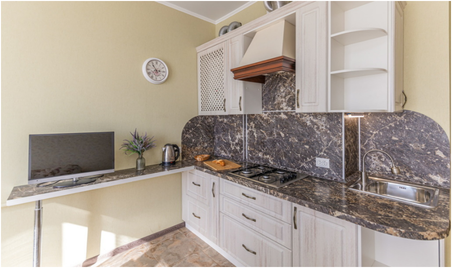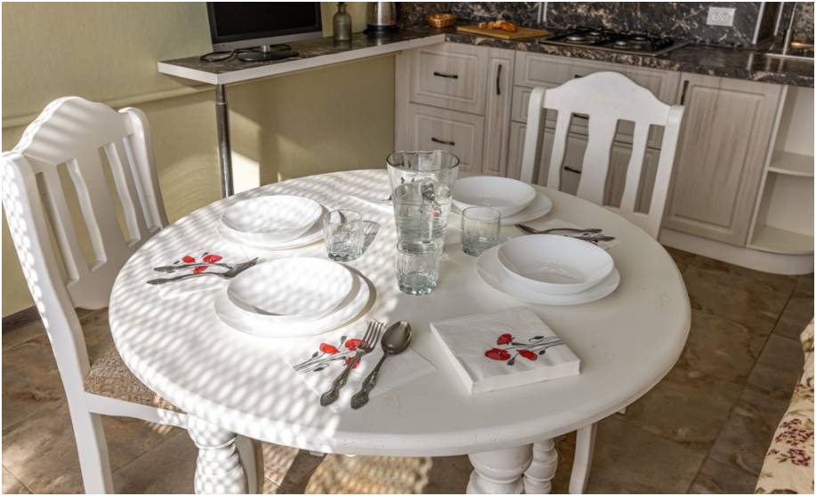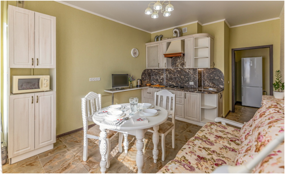 - Холодильник, духовой шкаф, варочная панель, посуда