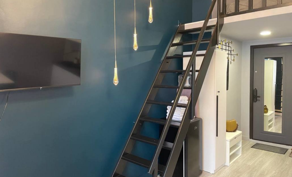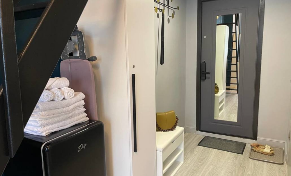Апартаменты с антресолью, где находится двуспальное место с ортопедическим матрасом и свежим постельным бельем. На нижнем уровне находится двуспальный диван, размером 140х200 см.