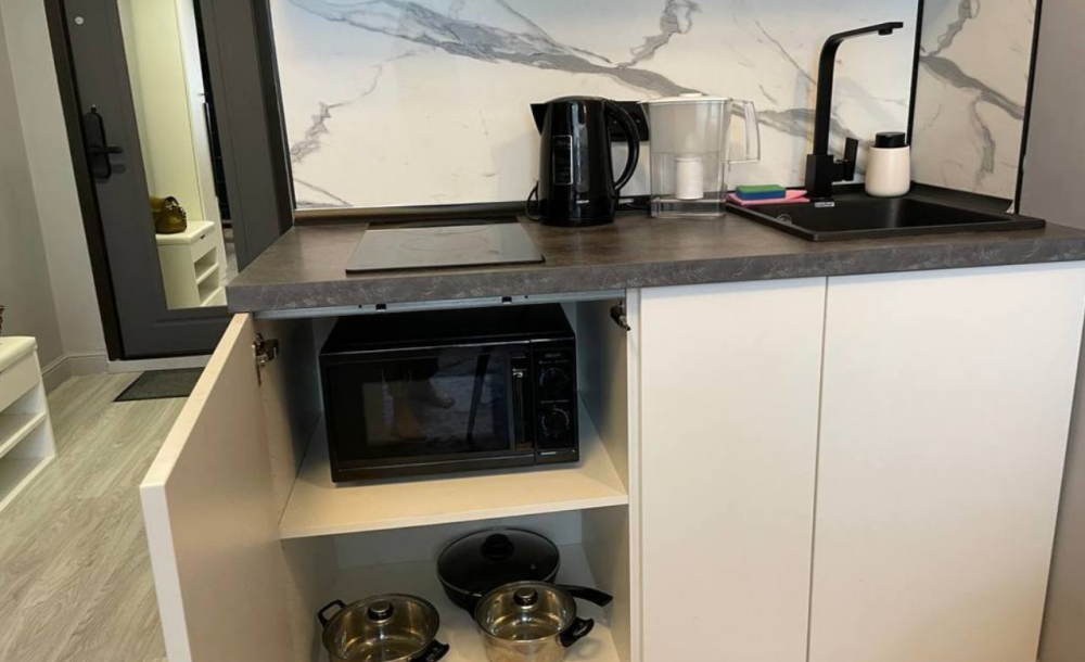 Зона кухни оборудована всей необходимой техникой и посудой (микроволновая печь, холодильник, электроплита, электрочайник, фильтр для воды).
