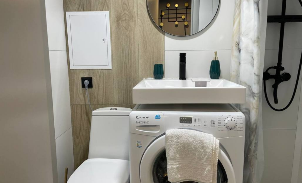 В душевой находится стиральная машина, фен, косметические средства и белоснежные полотенца. Дополнительный комплект постельного белья и полотенец обычно лежит в шкафу.