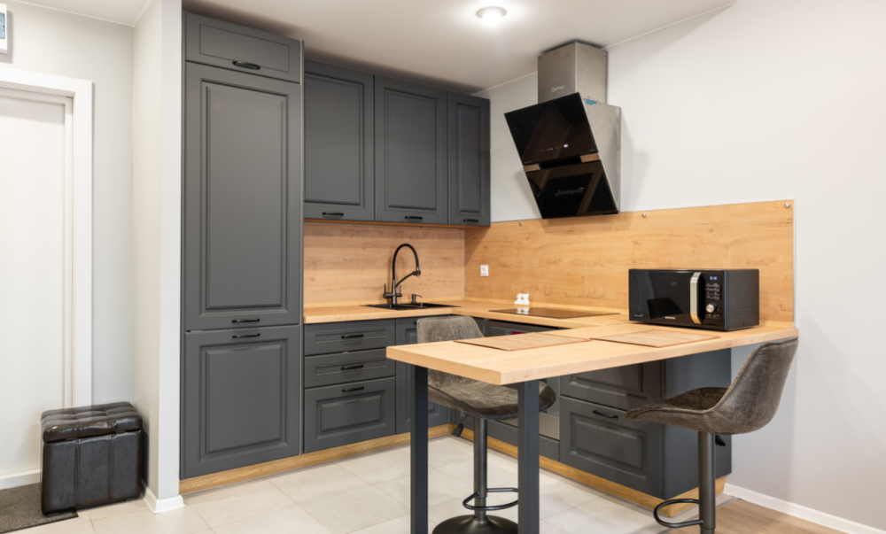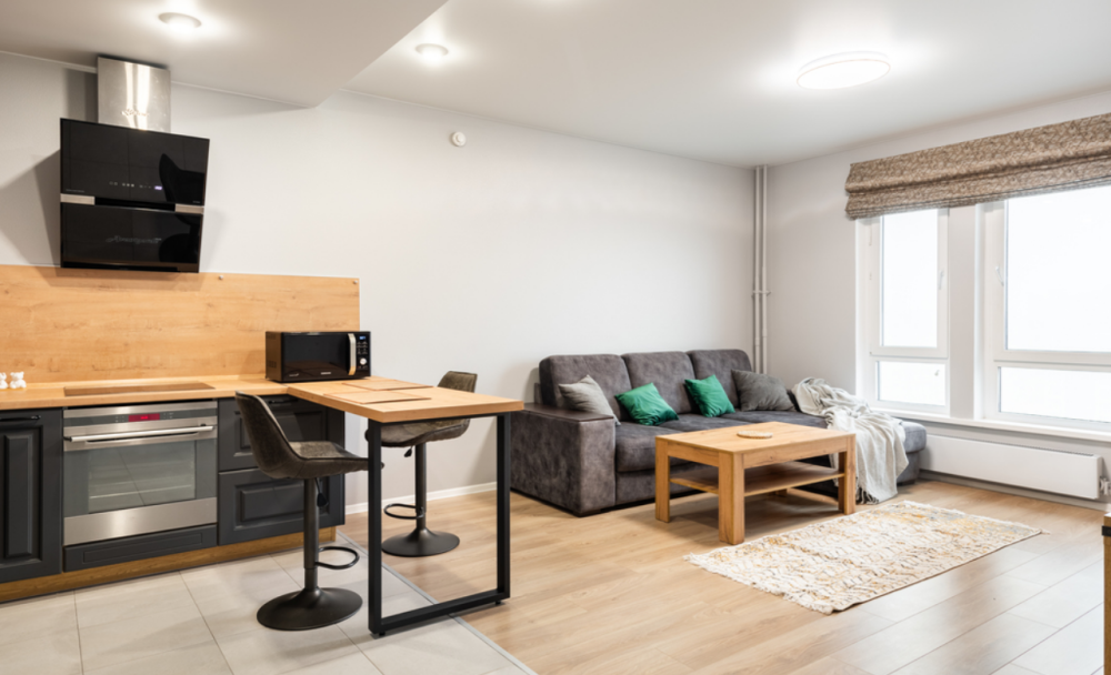 Кухня: просторная кухня - гостиная с дополнительным спальным местом - ортопедическим диваном. Кухня оборудована всей необходимой посудой и техникой.