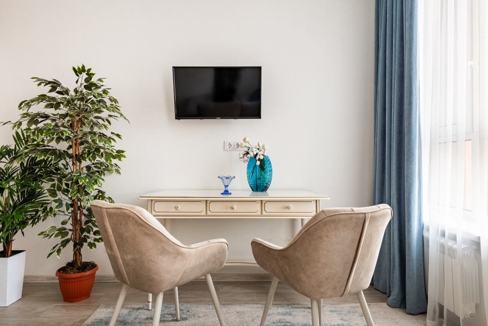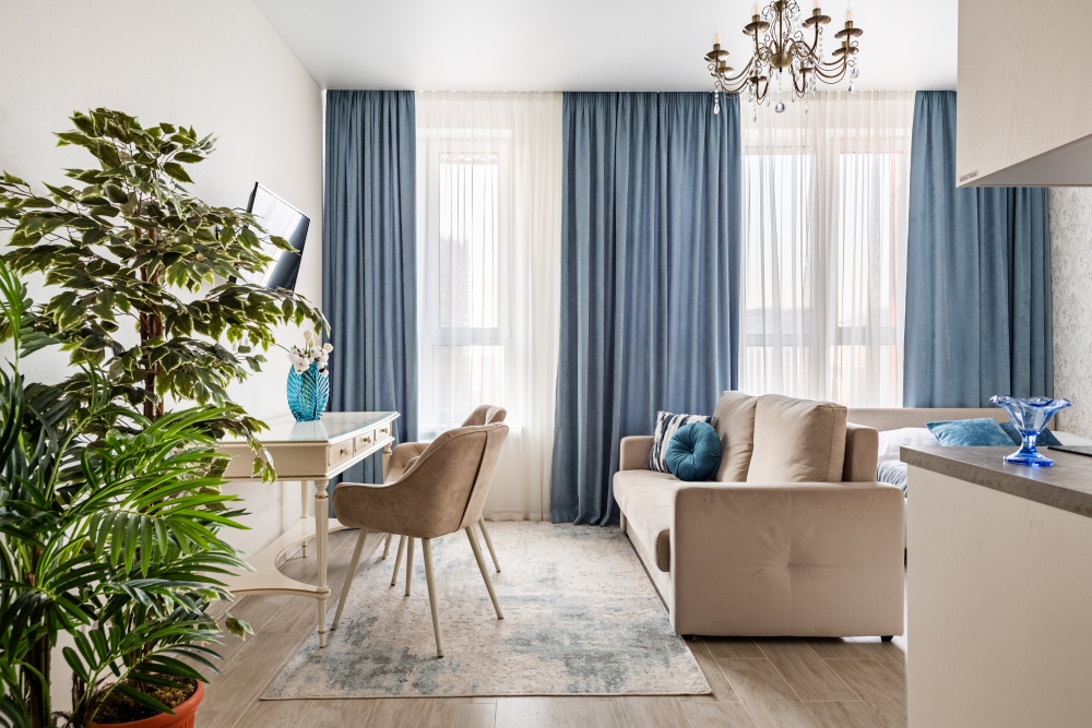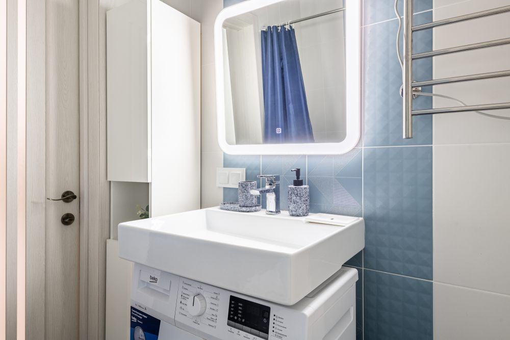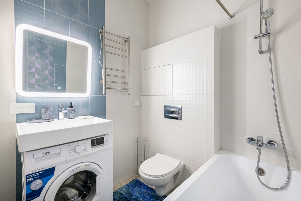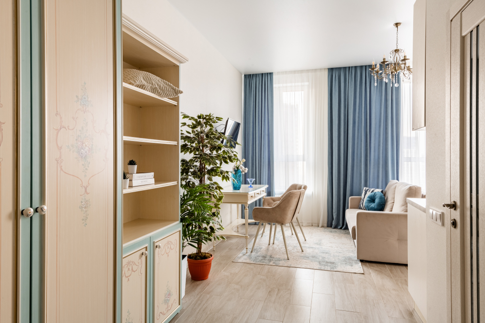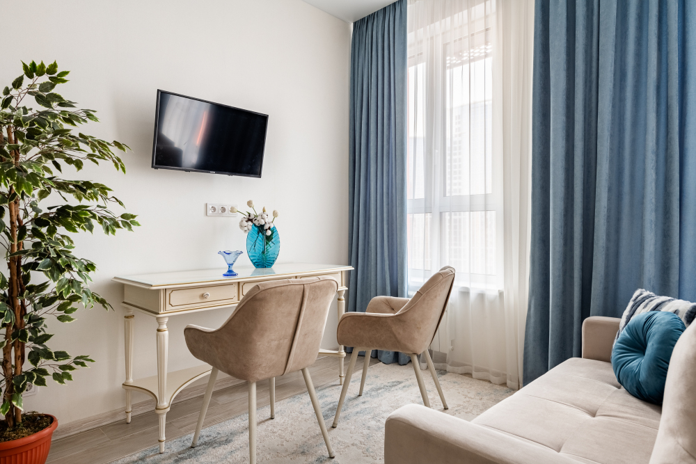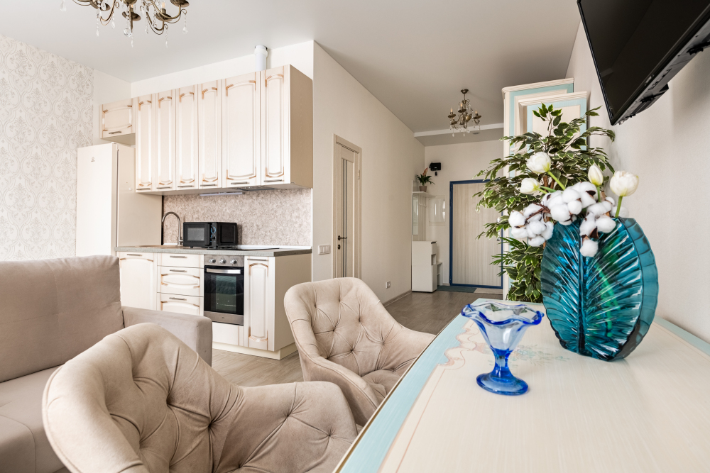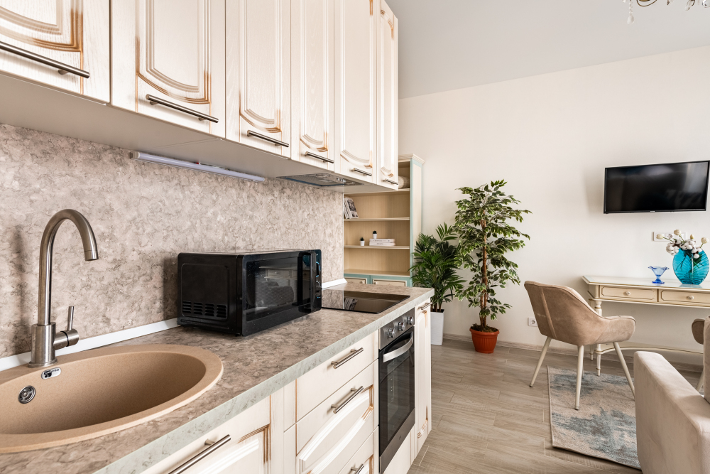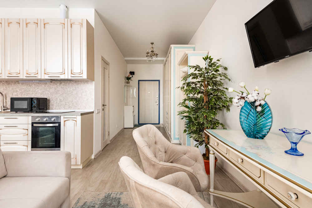 Мультимедиа: Wi-Fi, телевизор смарт ТВ; Бытовая техника: холодильник, плита, фен, утюг, стиральная машина, СВЧ;