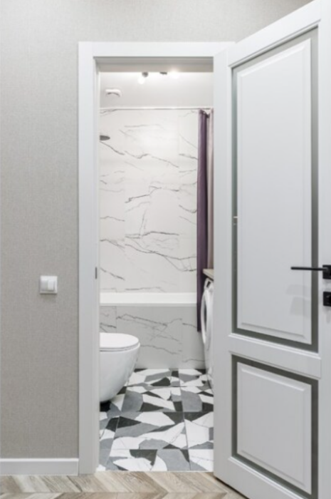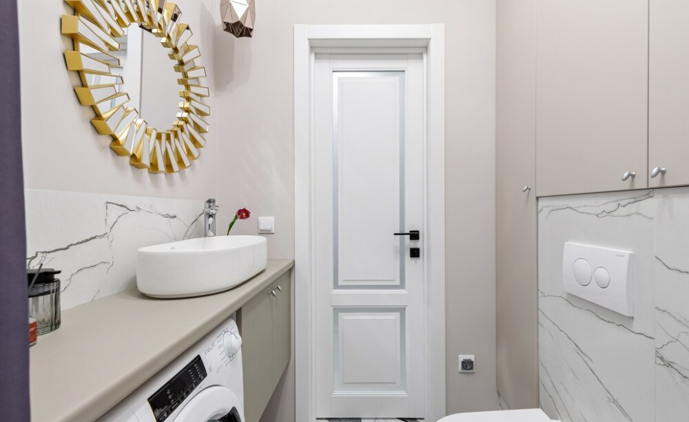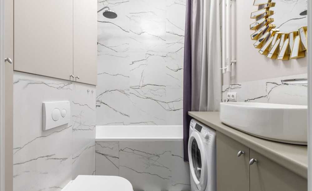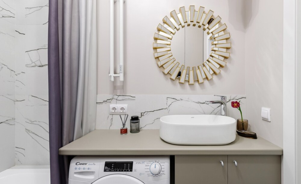— в ванной комнате находится стиральная машина, полотенцесушитель, бойлер, фен и белоснежные полотенца;