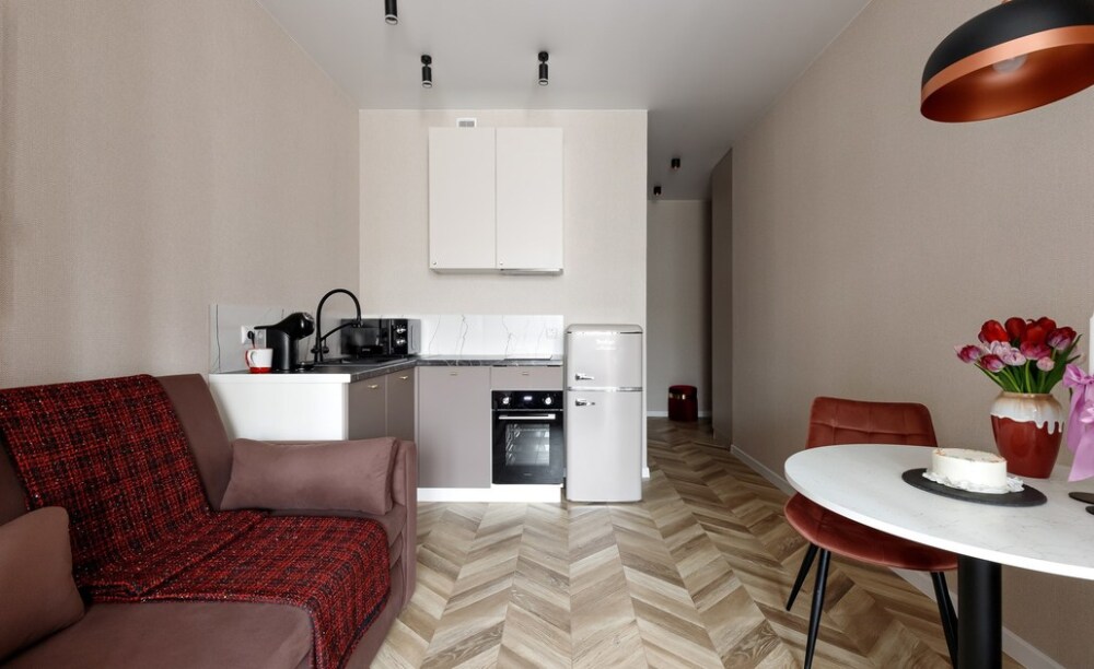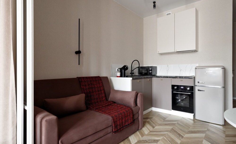 — в зоне кухни-гостиной размещен двуспальный диван (140x200), кухня оборудована всей необходимой техникой и посудой (микроволновая печь, холодильник, электроплита, вытяжка, электрочайник и духовой шкаф);
