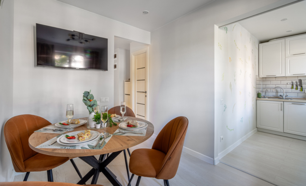 В гостиной размещен двуспальный диван (120x200), обеденный стол и ТВ. Кухня оборудована всей необходимой техникой и посудой (микроволновая печь, холодильник, газовая плита, духовка, посудомоечная машина).