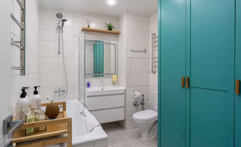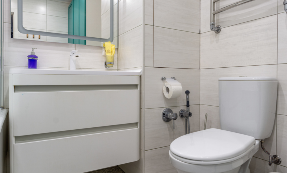 В ванной комнате находится большая ванна, стиральная машина, фен, косметические средства (шампунь, кондиционер для волос, гель для душа, зубные наборы) и белоснежные полотенца. Санузел оборудован гигиеническим душем.