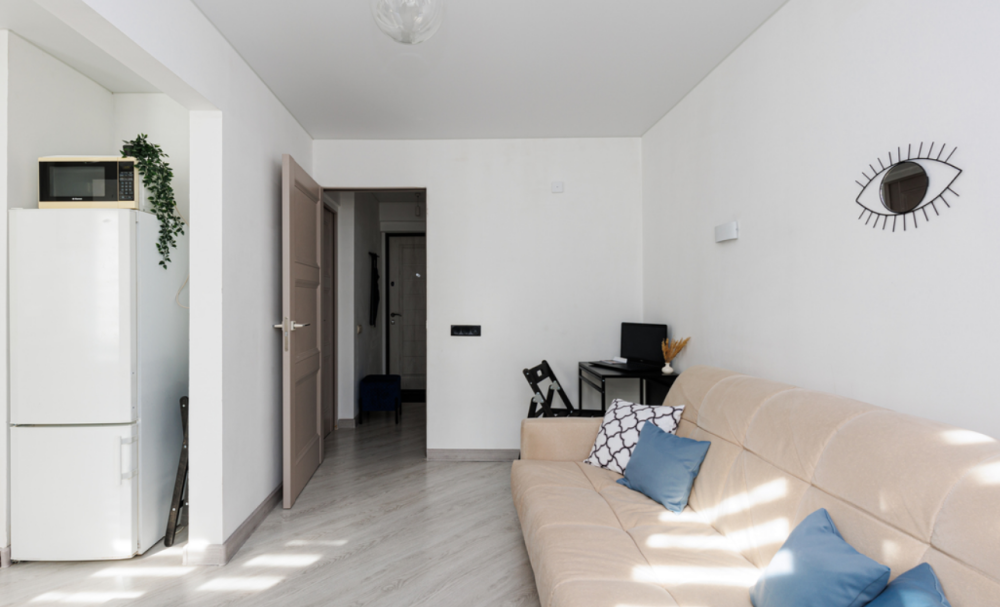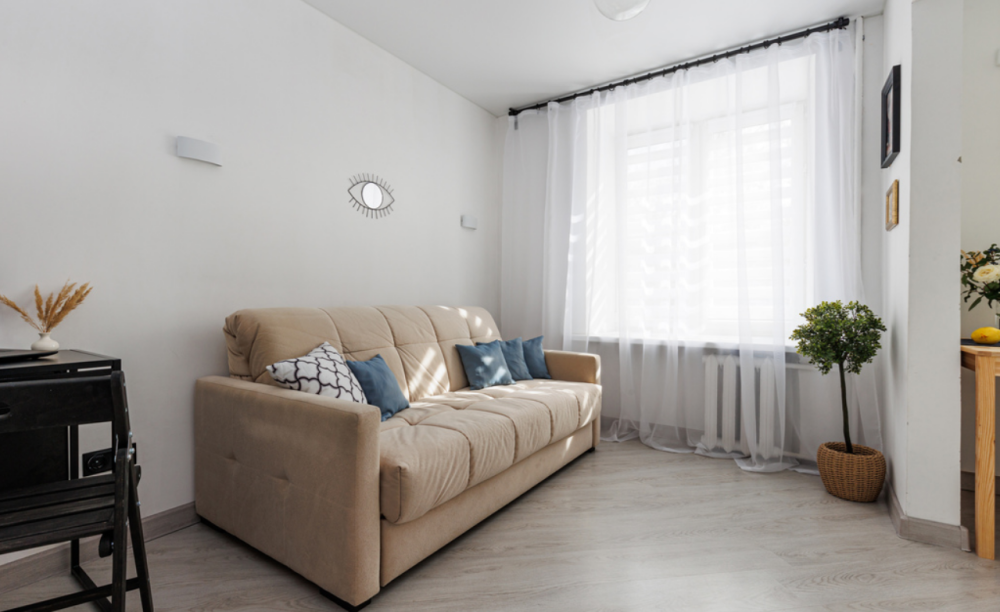 В комнате размещена двуспальная кровать (140x200) с ортопедическим матрасом и белоснежным постельным бельем, односпальный диван (120x196). В гостиной - двуспальный диван (160x200) и рабочий стол, где можно посидеть за ноутбуком.