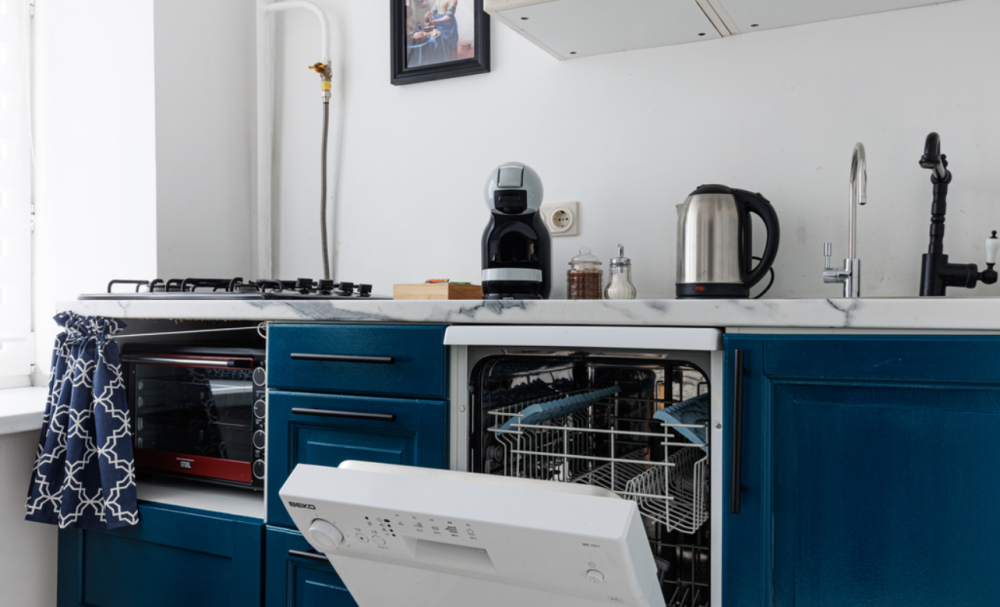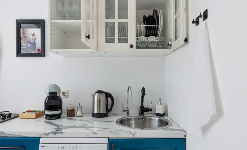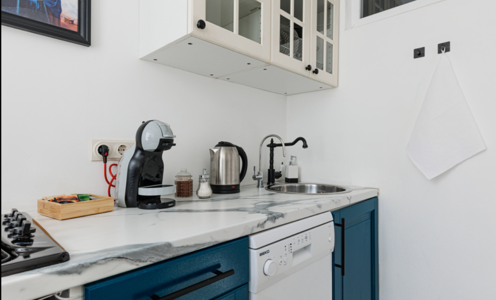 Кухня оборудована всей необходимой техникой и посудой (микроволновая печь, холодильник, газовая плита, мини-печь, посудомоечная машина, электрический чайник и кофемашина с кофе в капсулах).
