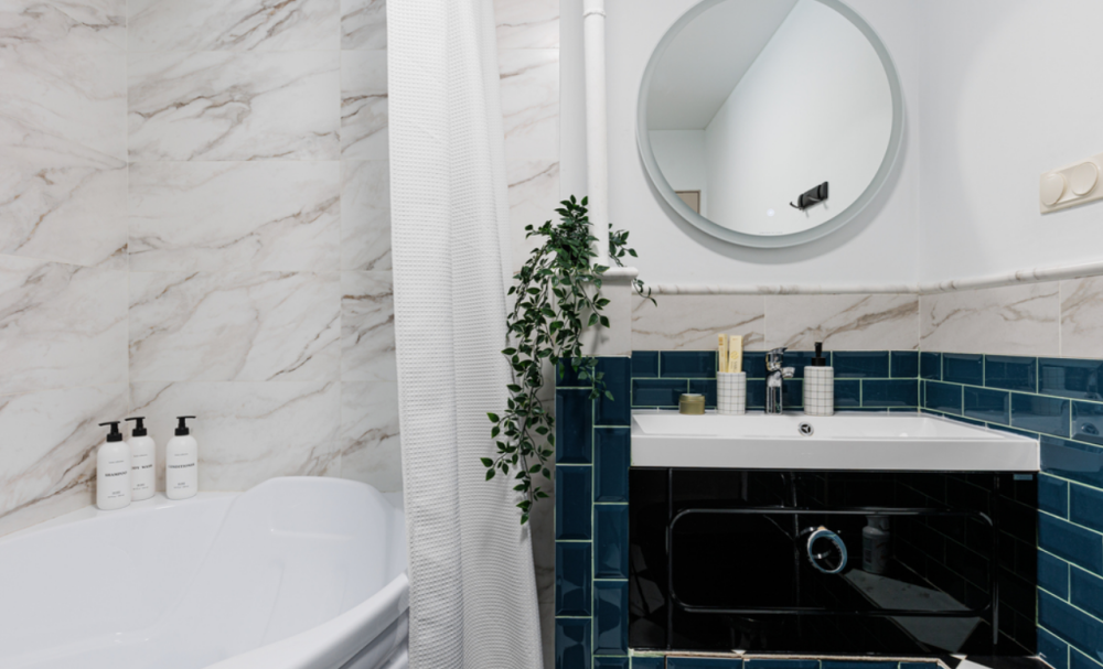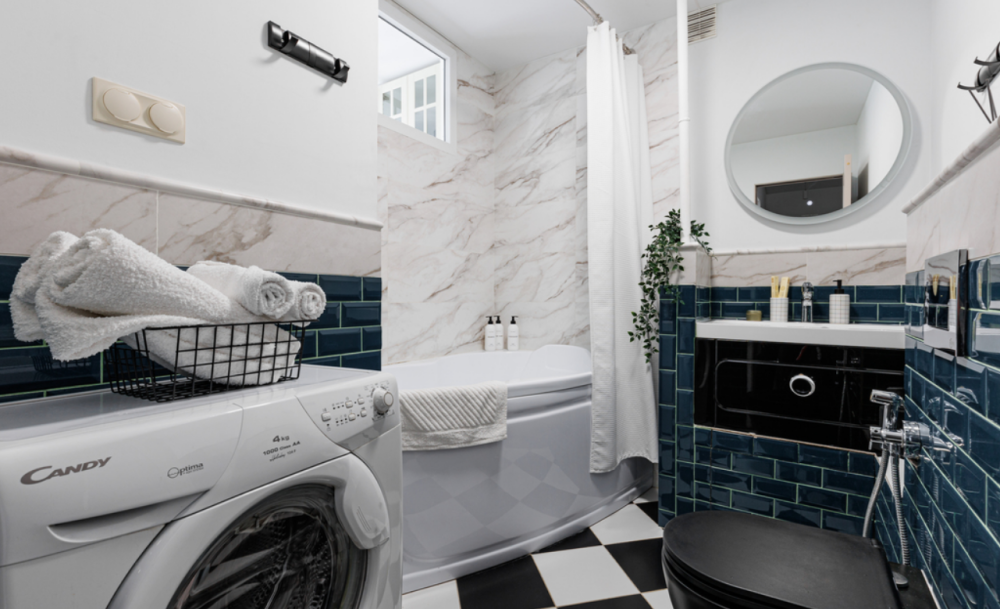 В ванной комнате находится большая ванна, стиральная машина, фен, косметические средства (шампунь, кондиционер для волос, гель для душа, зубные наборы) и белоснежные полотенца. Санузел оборудован гигиеническим душем.