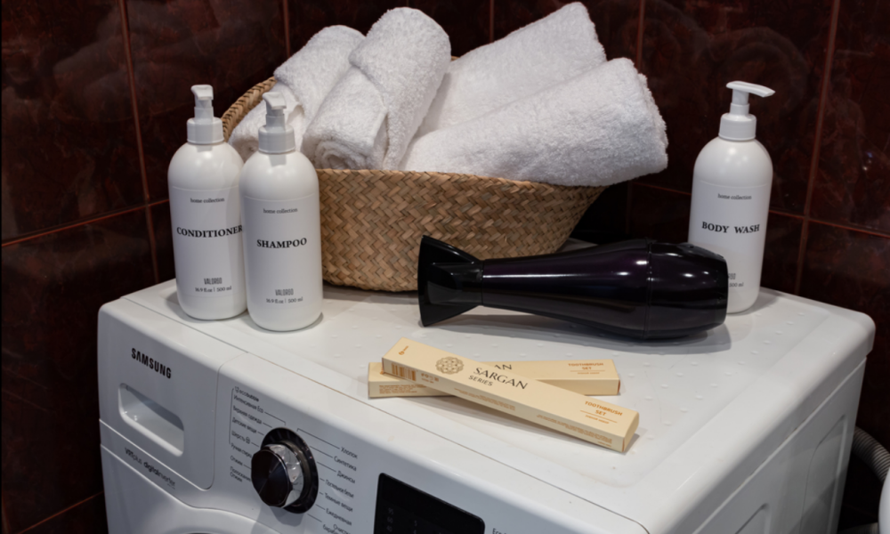В ванной комнате находится стиральная машина и фен, косметические средства и белоснежные полотенца.