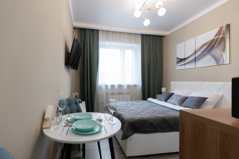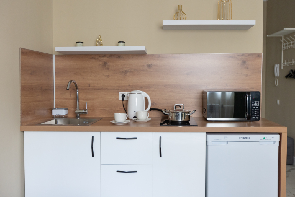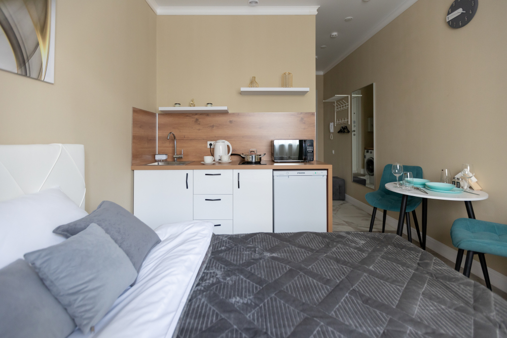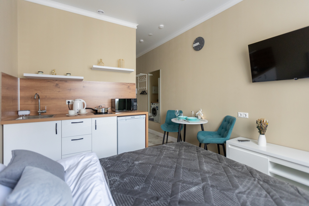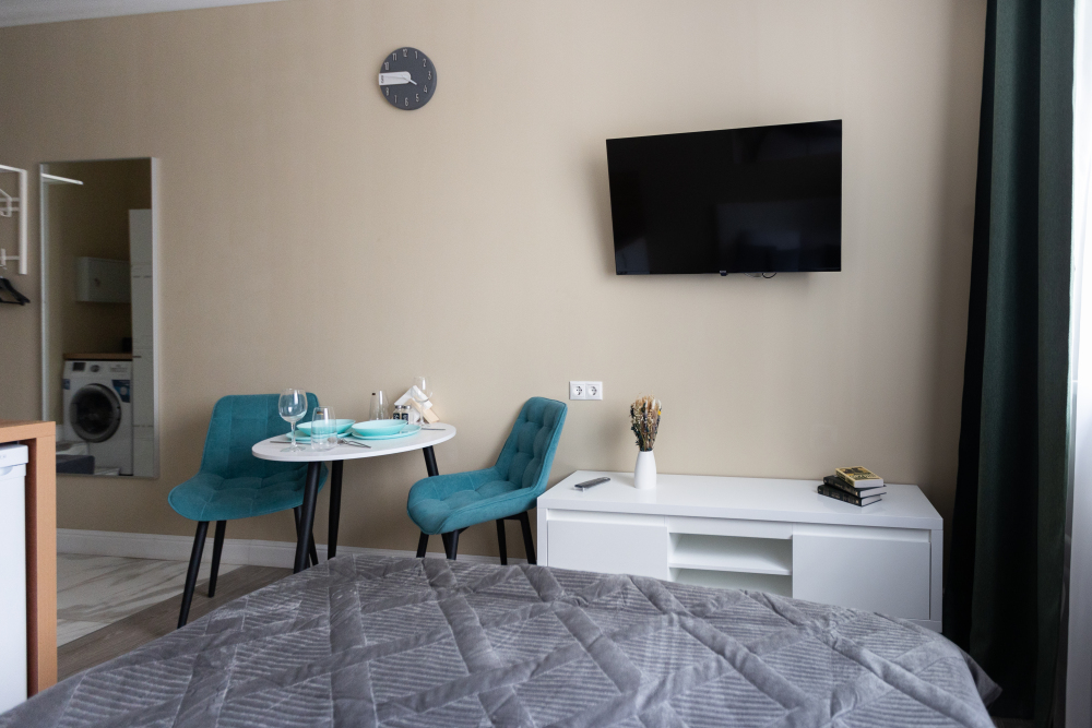 Оснащение: кухня, телевизор, холодильник, электрический чайник, микроволновая печь, электрическая плита, фен, стиральная машина.