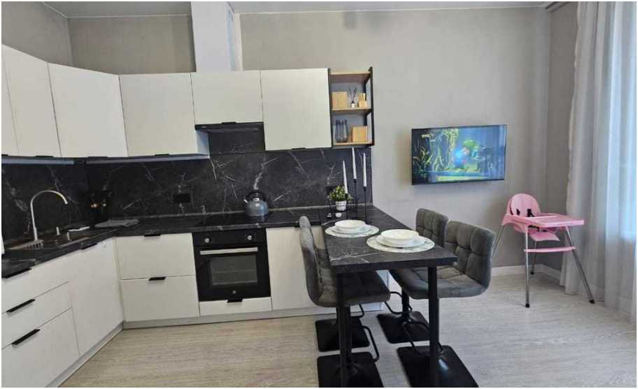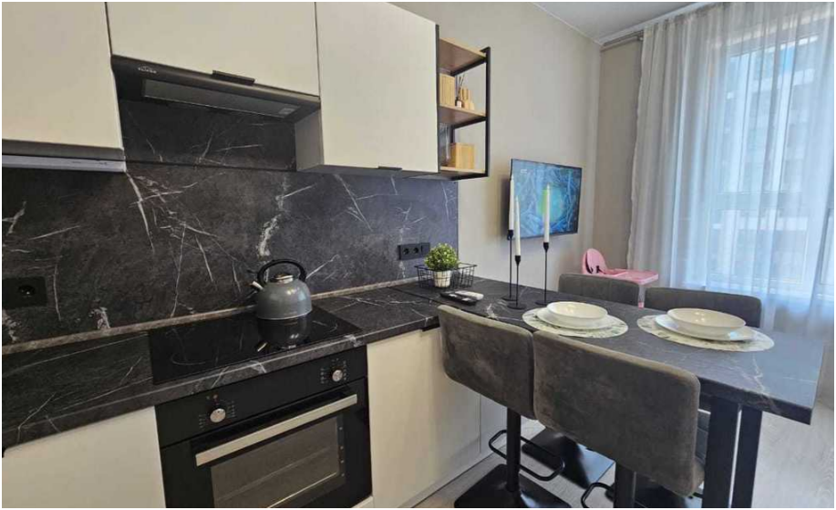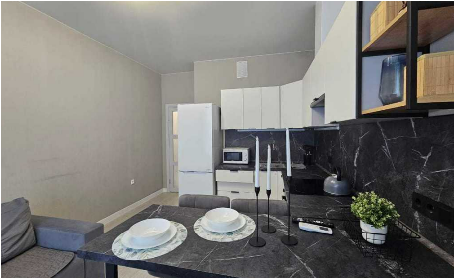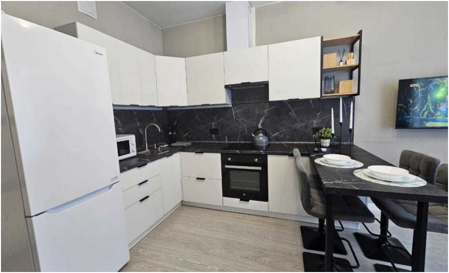 - Оборудованная посудой и техникой кухня, где есть варочная панель, большой холодильник, СВЧ и чайник.