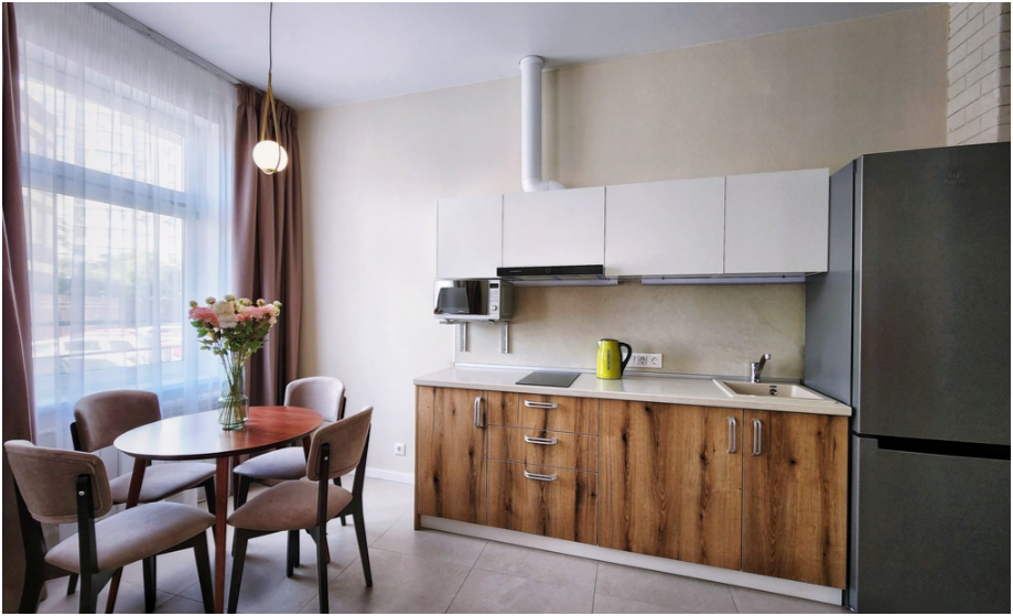 - Оборудованная посудой и техникой кухня, где есть варочная панель, духовой шкаф большой холодильник, СВЧ и чайник.