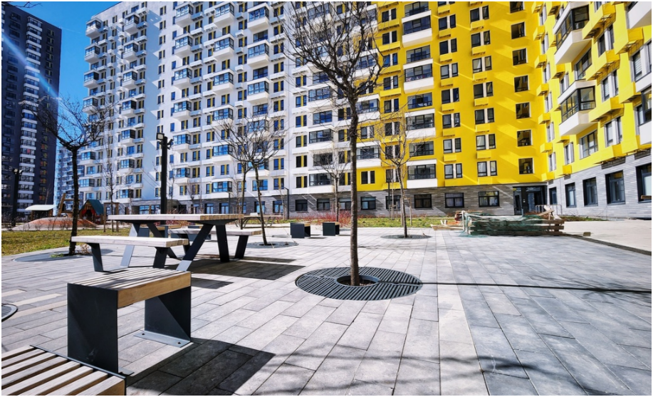 Территория возле дома спроектирована по принципу «многоуровневого ландшафта»: пешеходный бульвар, места для отдыха и прогулок вписаны в естественные природные рельефы, а на первых этажах домов - магазины, кафе и полезные сервисы и парковка.