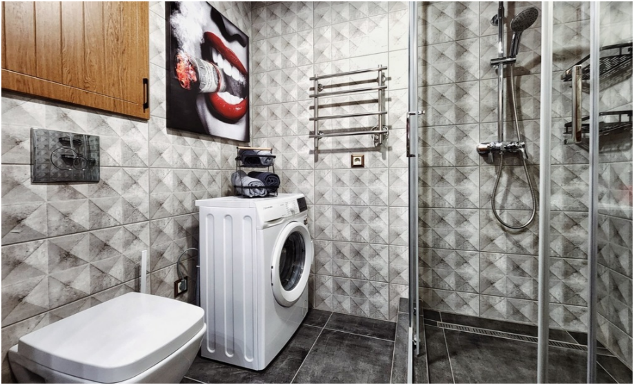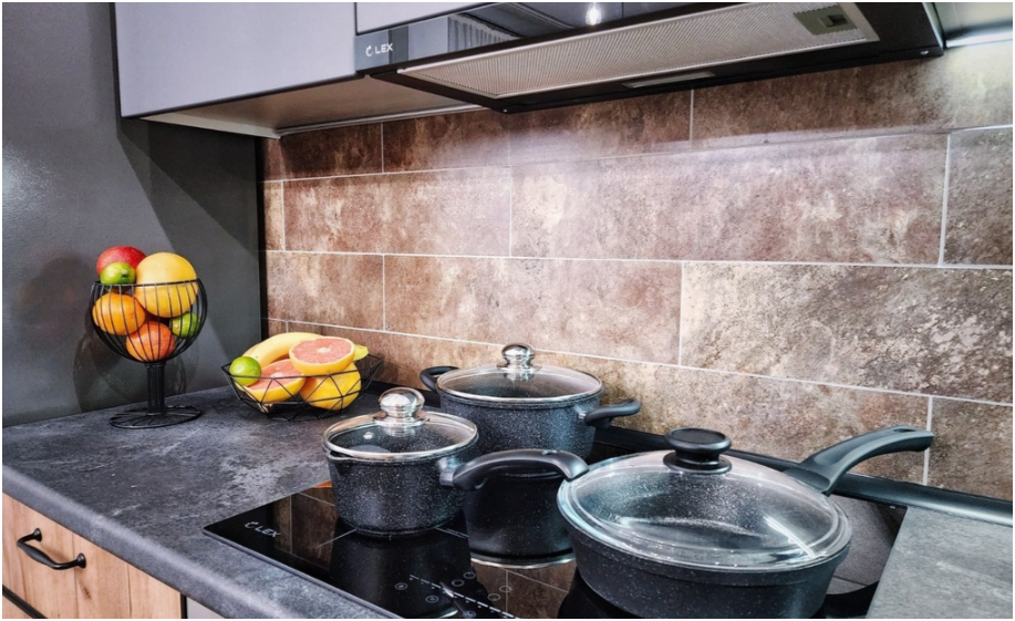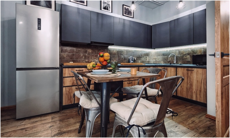 - Оборудованная посудой и техникой кухня, где есть варочная панель, посудомоечная машинка, духовой шкаф большой холодильник, СВЧ и чайник.
