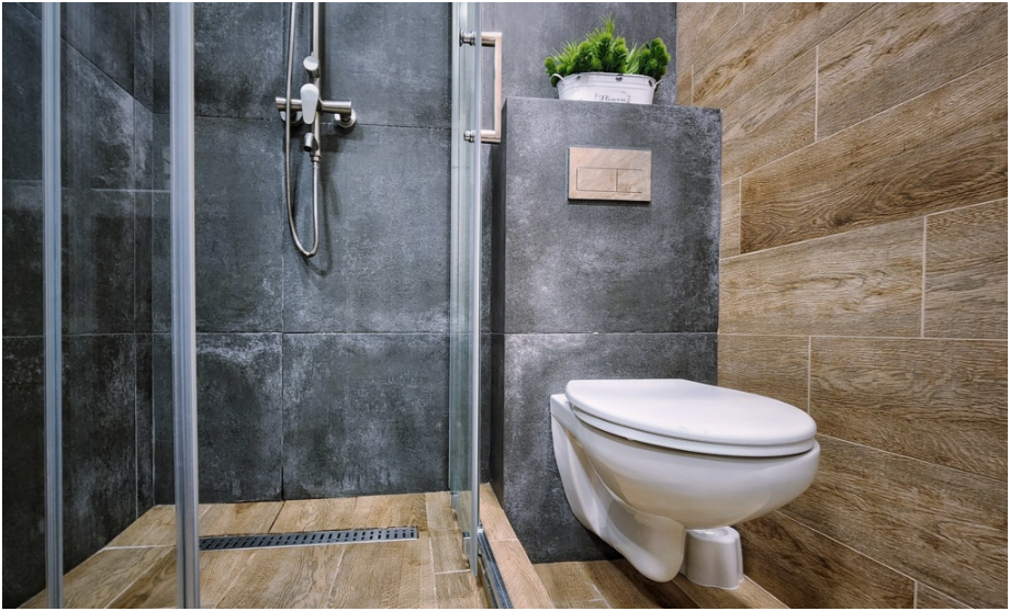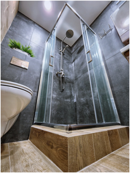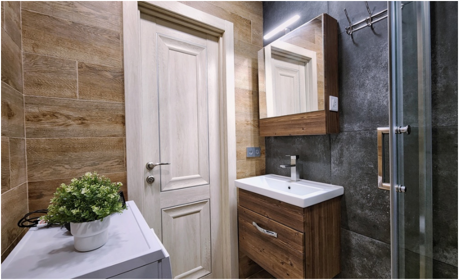 - Ванная комната со стиральной машиной и душевой кабинкой.