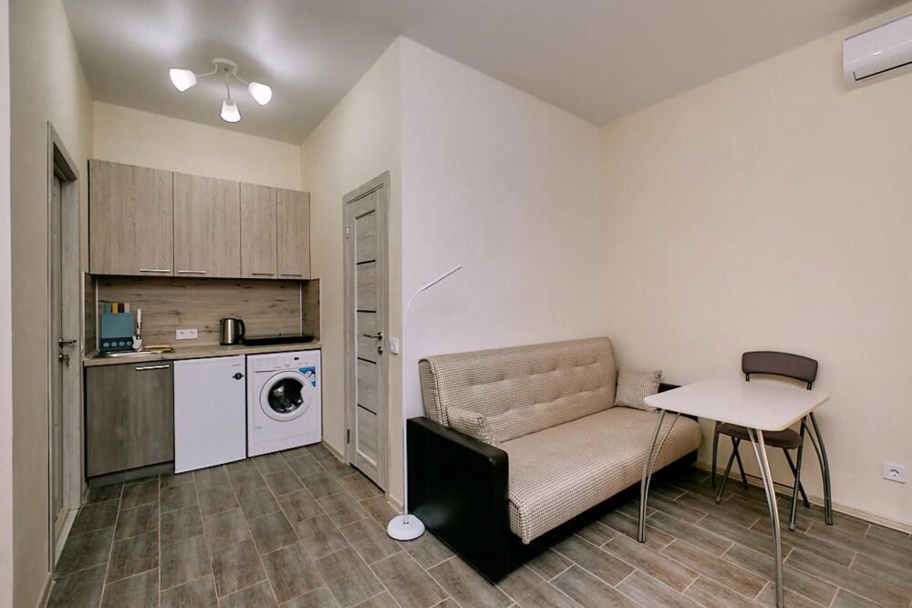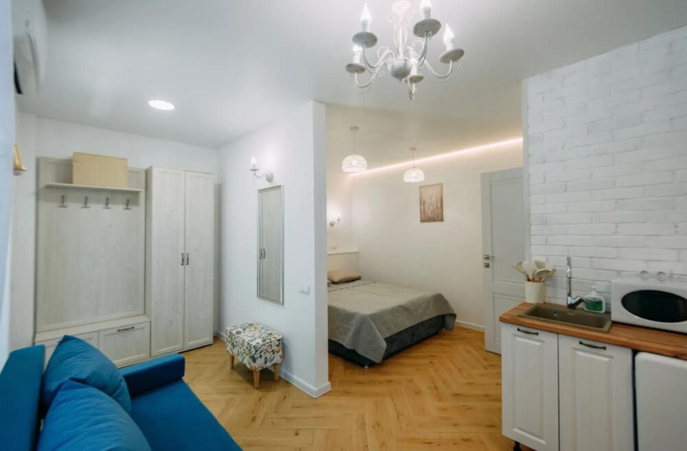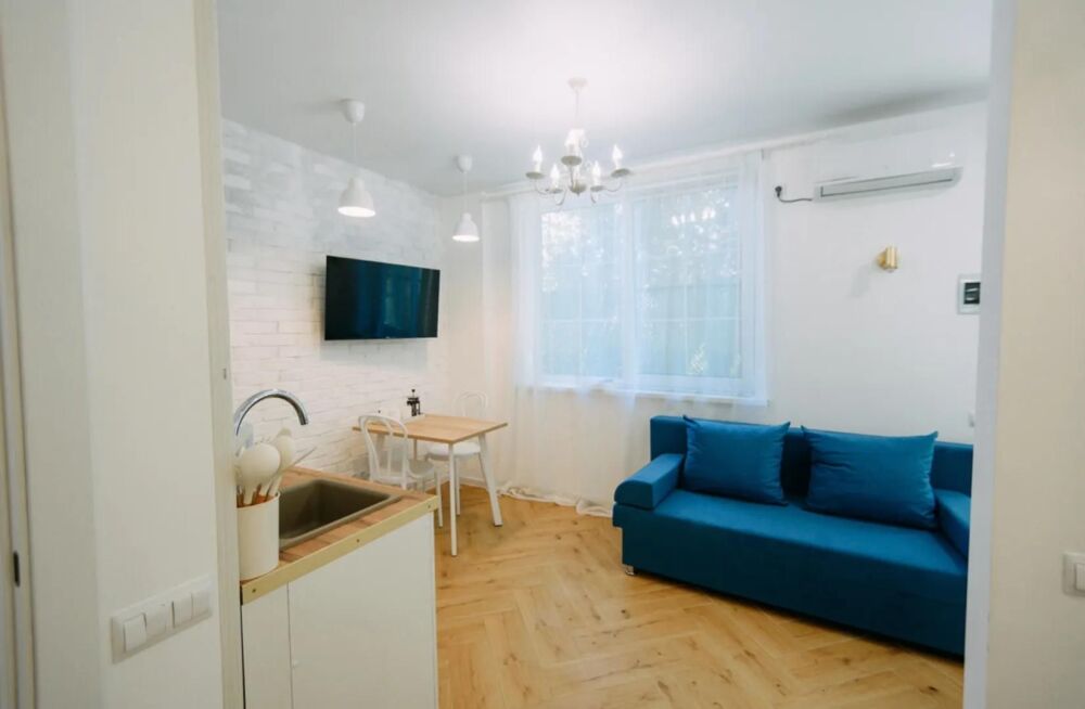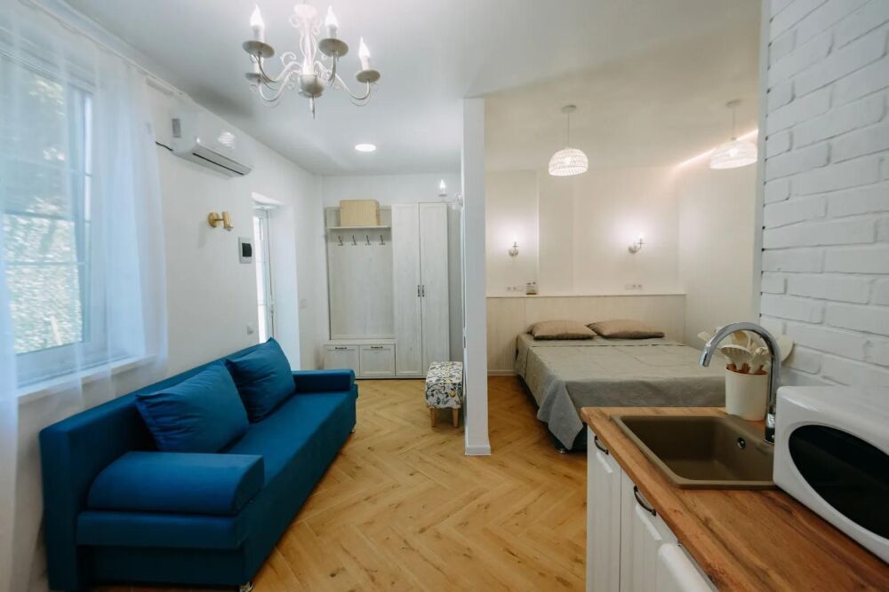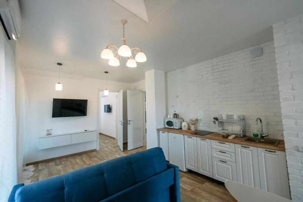 Абсолютно новая студия. Полностью укомплектована для Вашего отдыха. Есть зона спальни с двуспальной кроватью и ортопедическим матрасом, зона гостиной с комфортным раскладным диваном. Полностью оборудованная кухня: холодильник, плита с 2 конфорками, микроволновка, электрический чайник, набор посуды. Высокоскоростной интернет. Смарт ТВ.