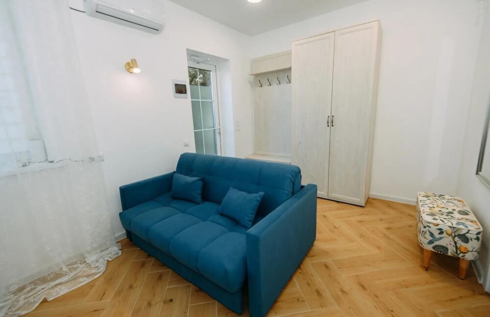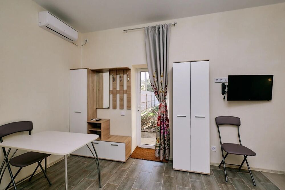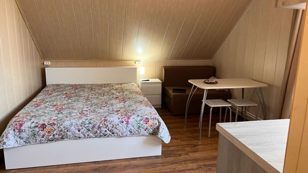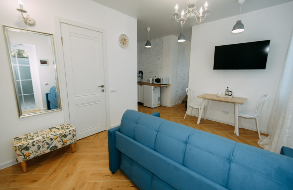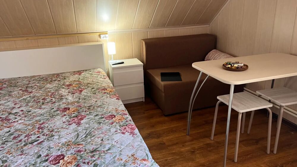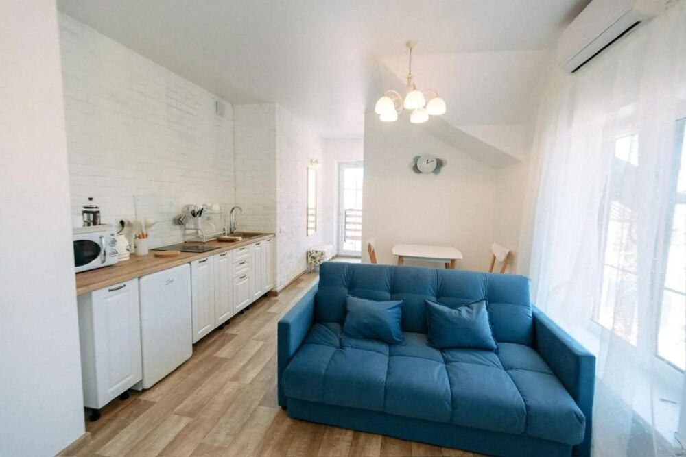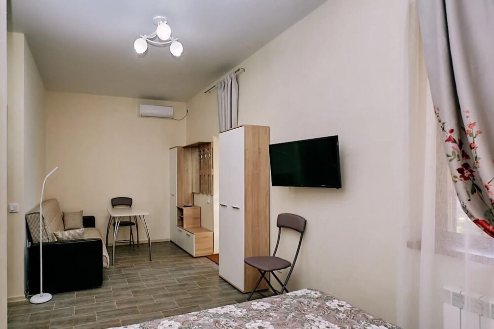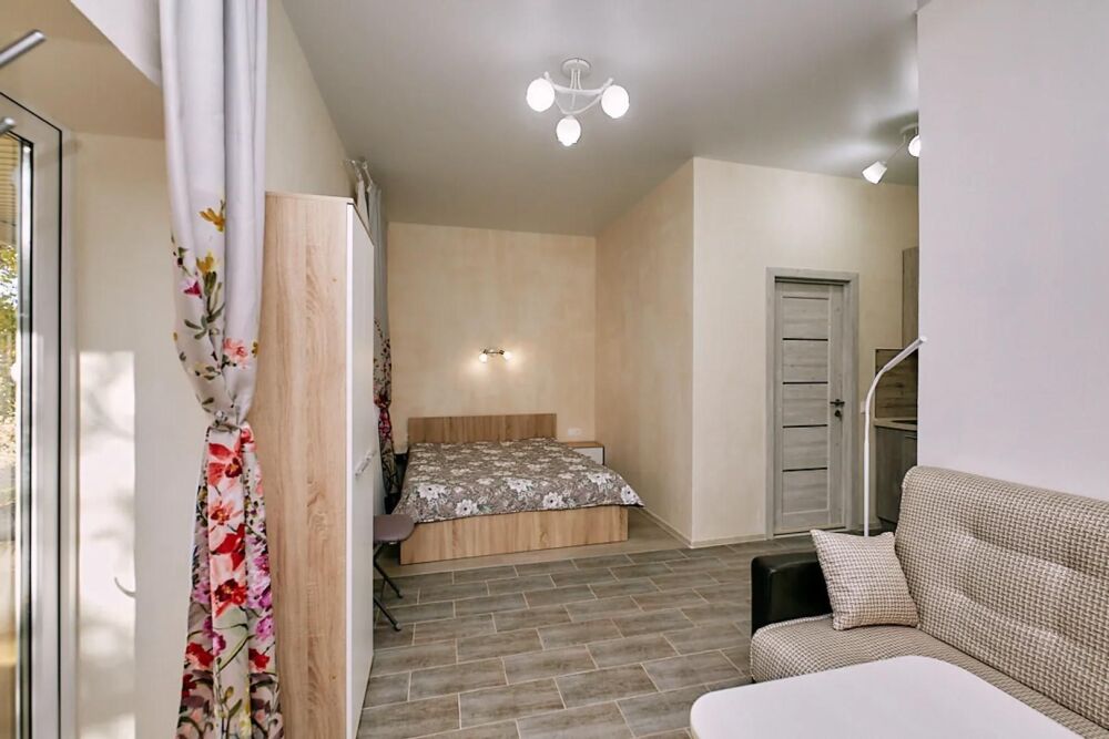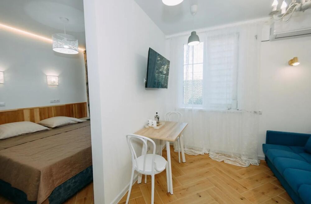 Уютная студия, оборудованная всем необходимым для отдыха. В студии есть: кондиционер, телевизор, душевая кабина, кухня, кровать с ортопедическим матрасом, раскладывающийся диван.