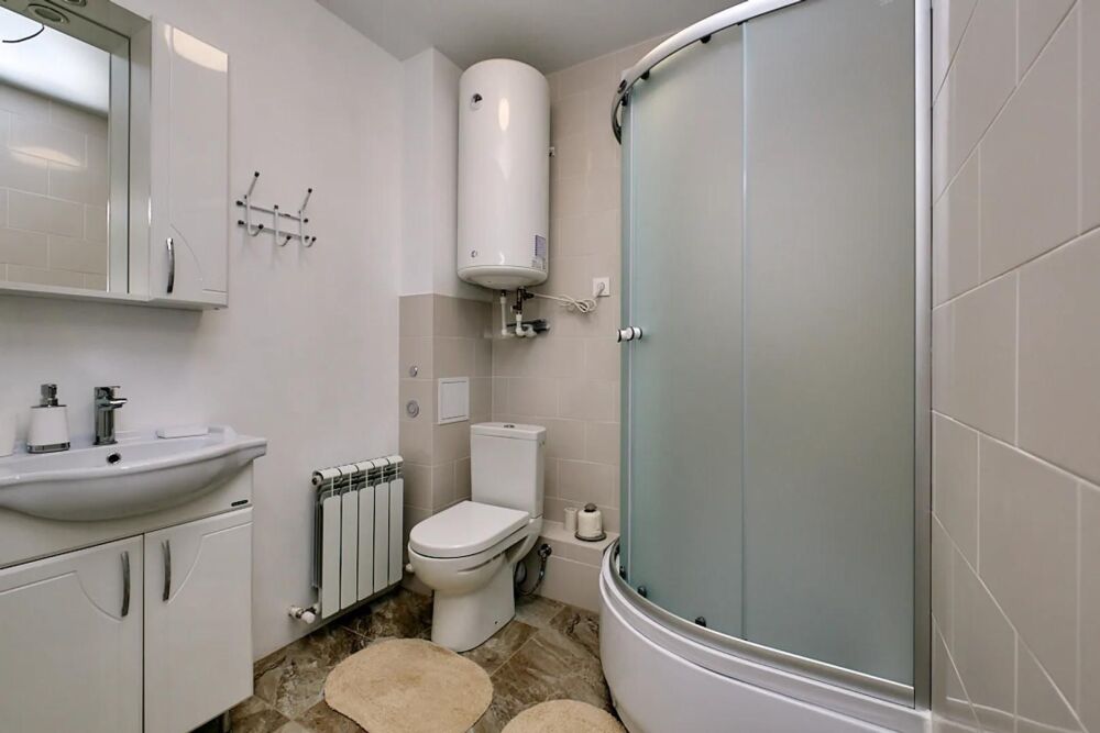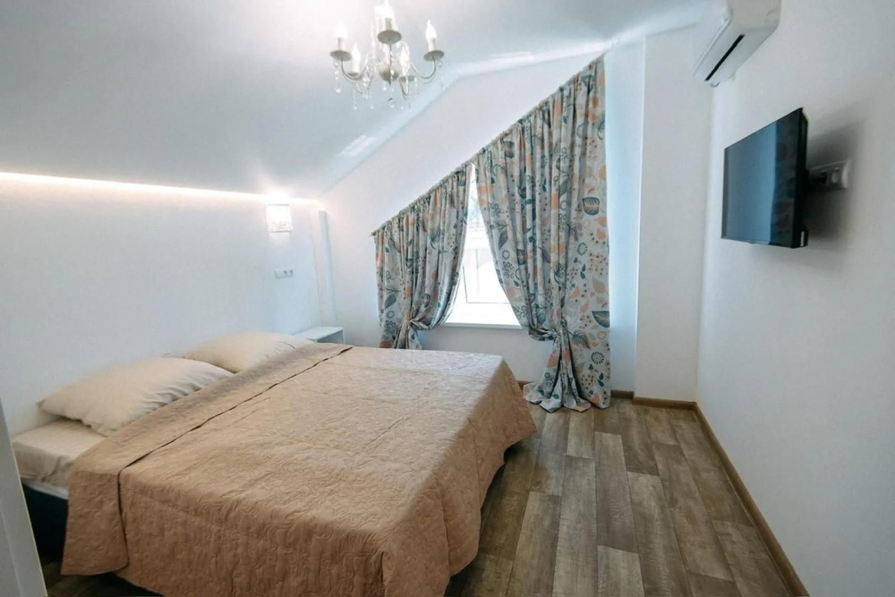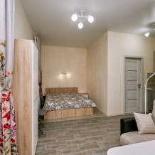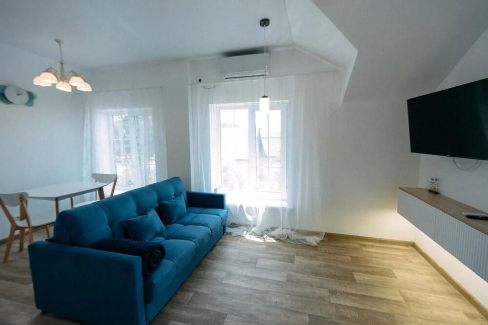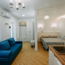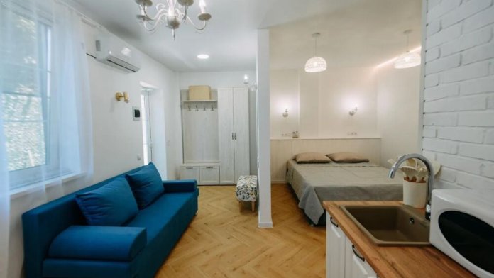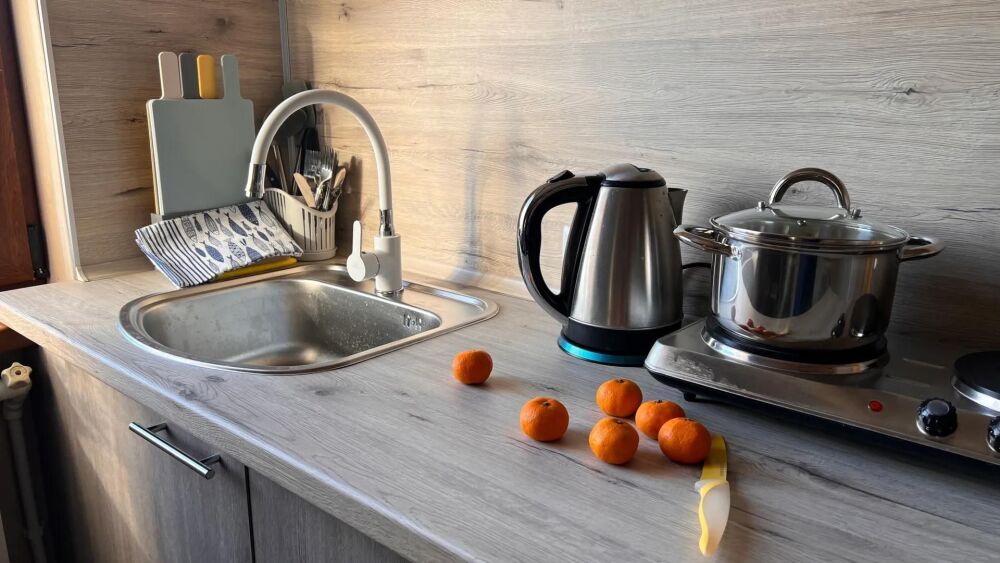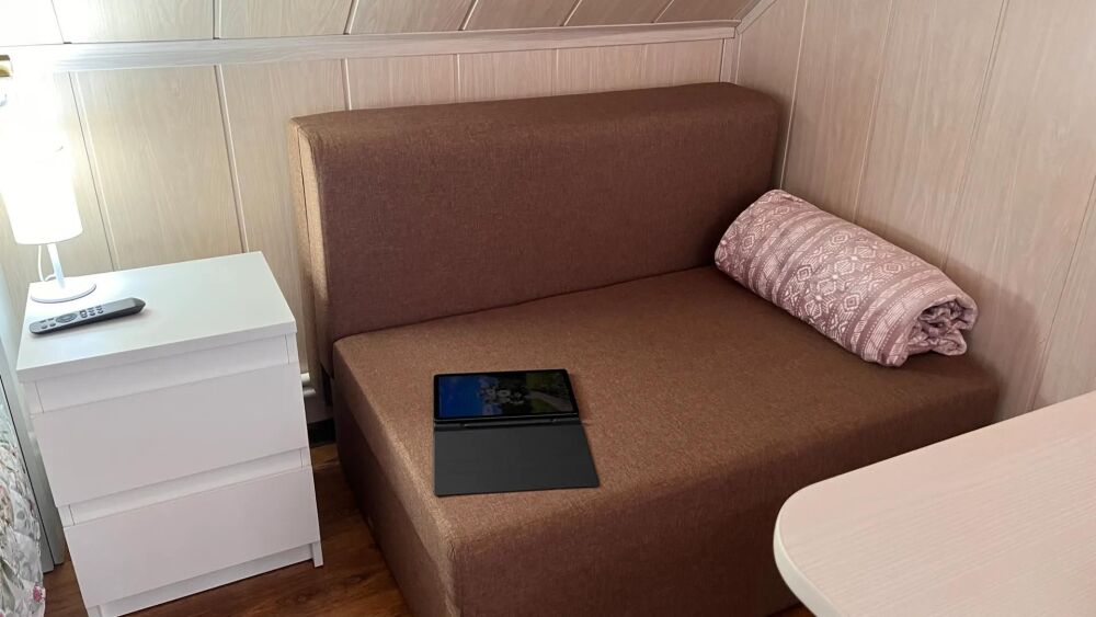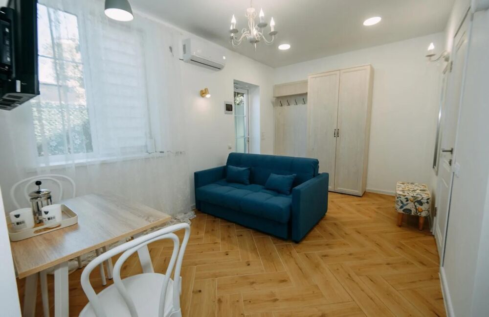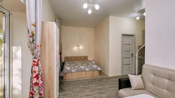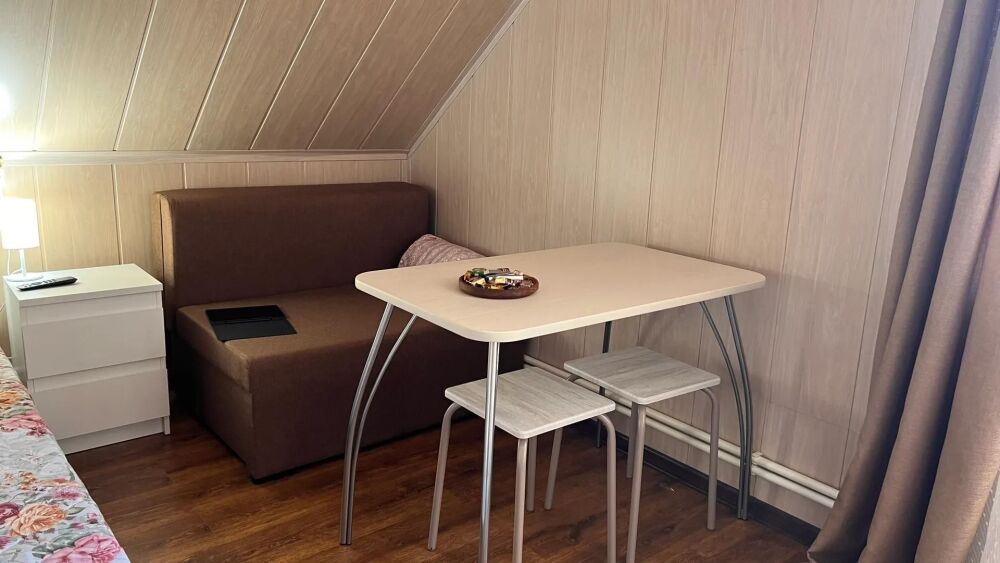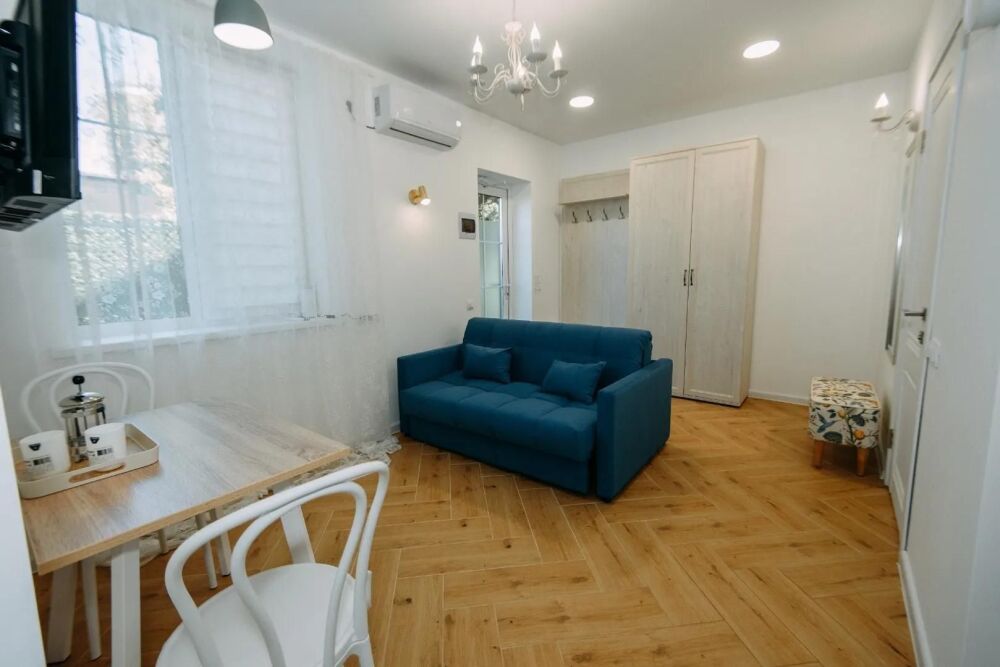 Уютная студия, оборудованная всем необходимым для отдыха. В студии есть: кондиционер, телевизор, душевая кабина, кухня, кровать с ортопедическим матрасом, раскладывающийся диван.