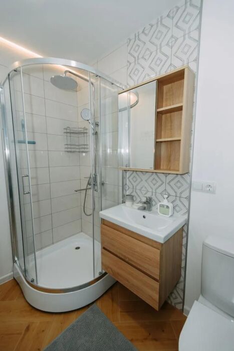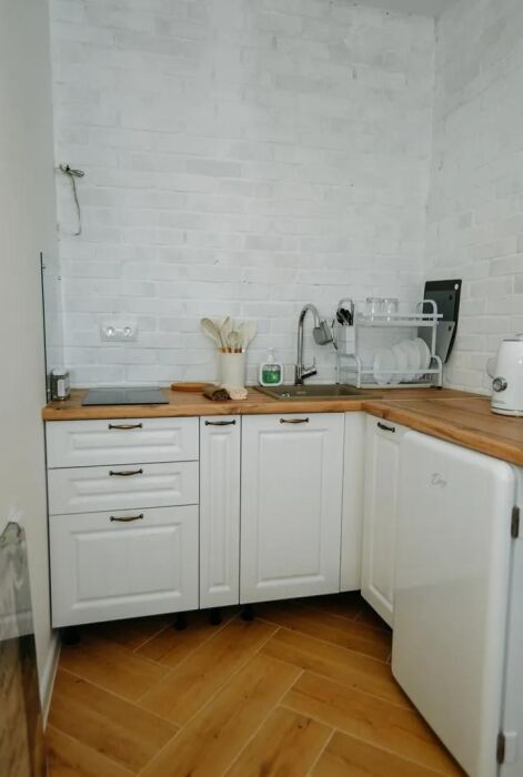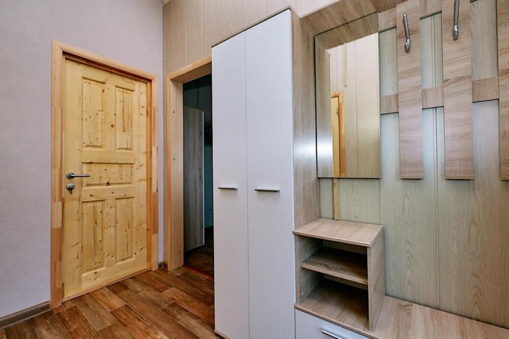 Абсолютно новая, только что после ремонта, новая мебель, бытовая техника, посуда. Внутри есть всё для комфортного проживания. Установлен бойлер, кондиционер, есть стиральная машинка, сушилка, гладильная доска, утюг, постельное белье, полотенца, красивые шторы, покрывало, пледы, одеяла, подушки.