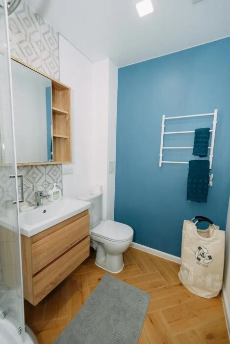Отдельная спальня, кухня-гостиная, ванная, гардеробная. Апартаменты оборудованы с заботой о Вашем отдыхе: постельное бельё отличного качества, ортопедический матрас, полотенца, качественная посуда, Wi-Fi, смарт тв, светильники, подсветки светодиодными лентами. Балкон с видом на море оборудован садовой мебелью.