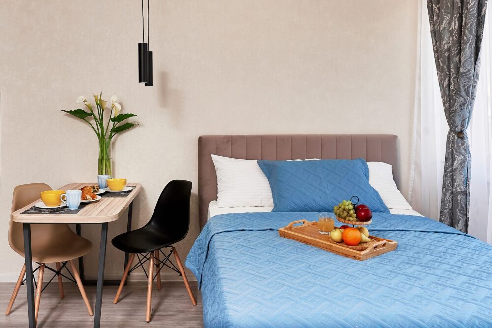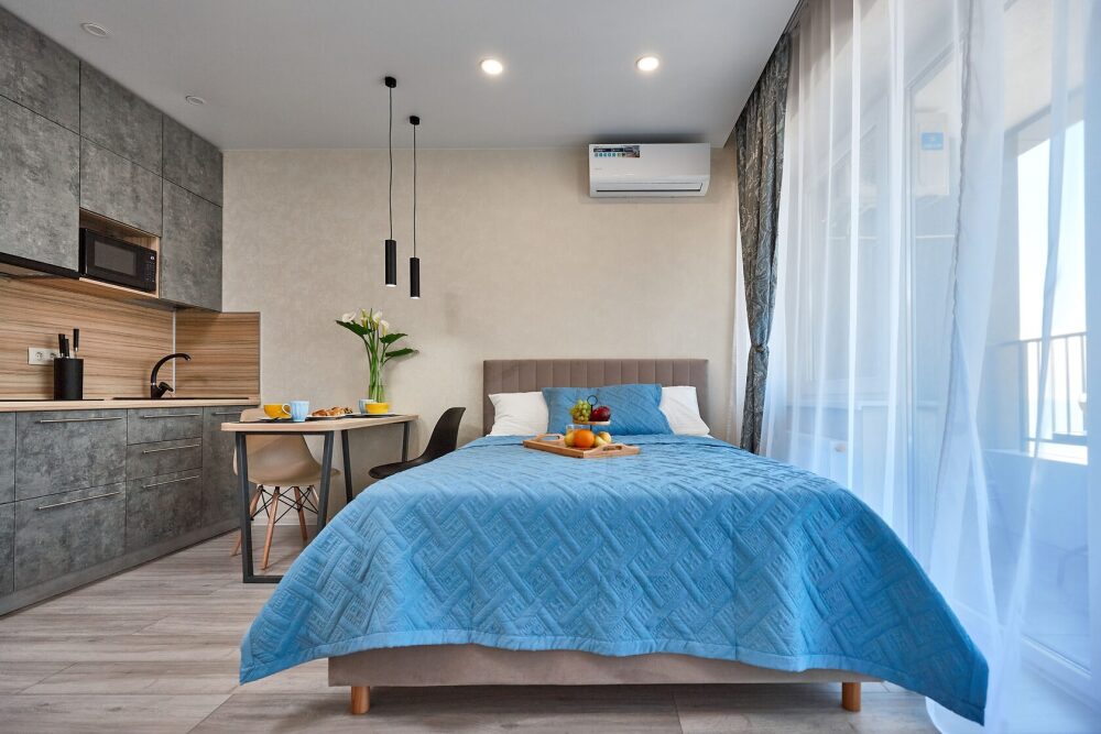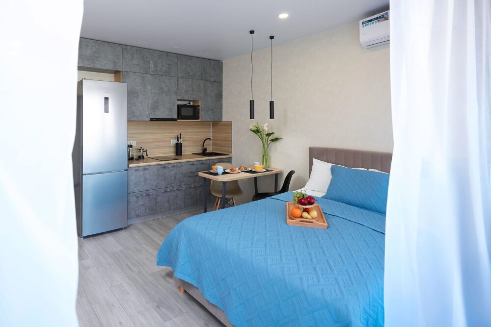 Стильные апартаменты-студия «Сonfetti» в ЖК «Каравелла Португалии», c дизайнерским ремонтом и прямым видом нa мopе, для 2-4 человек. В квартире имеется всё необходимое для комфортного проживания.