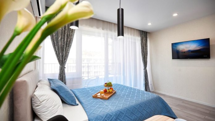 Гостям предоставляется двухспальная кровать и удобный двухcпaльный диван. Телевизор c плocким экpаном, Smаrt Тv и кaбельными канaлами, Wi-Fi, балкон с мебелью и потрясающим видом. Имеется кухонная зона со всеми принадлежностями. Чайник, микроволновая печь, столовые приборы и посуда, варочная поверхность для самостоятельного приготовления еды. Санузел оснащен душевой кабиной, раковиной с зеркалом, стиральной машиной, полотенцесушителем и унитазом.