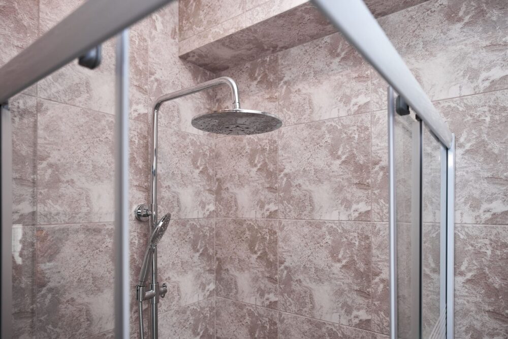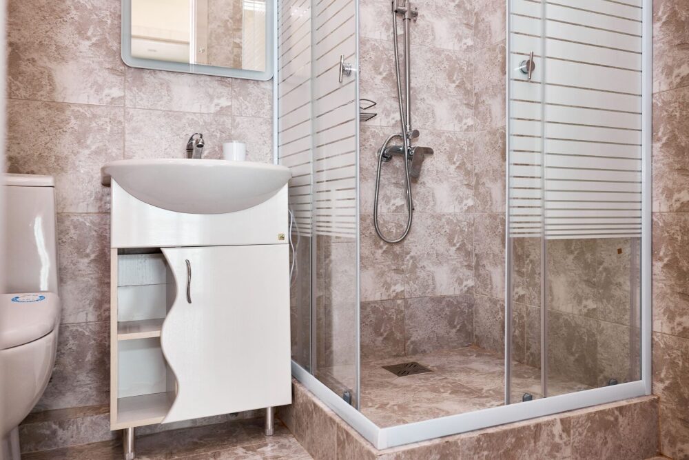 Санузел оснащен раковиной с зеркалом, душевой кабиной, унитазом, полотенцесушителем.