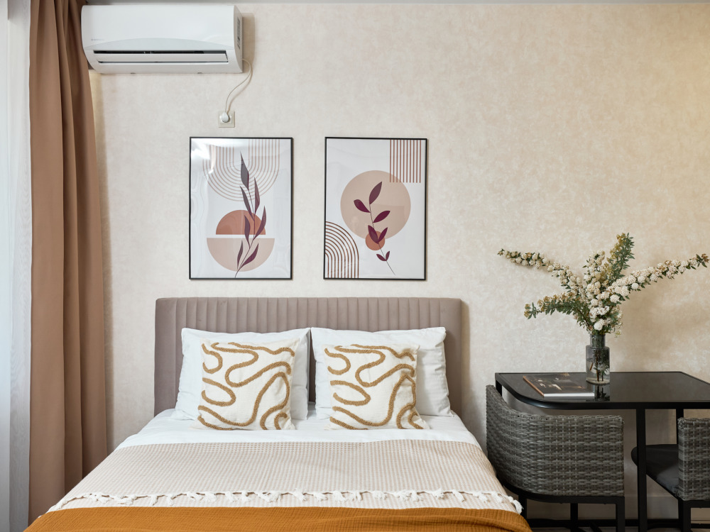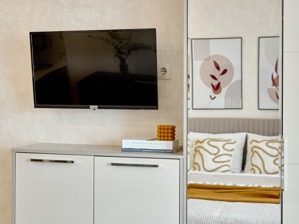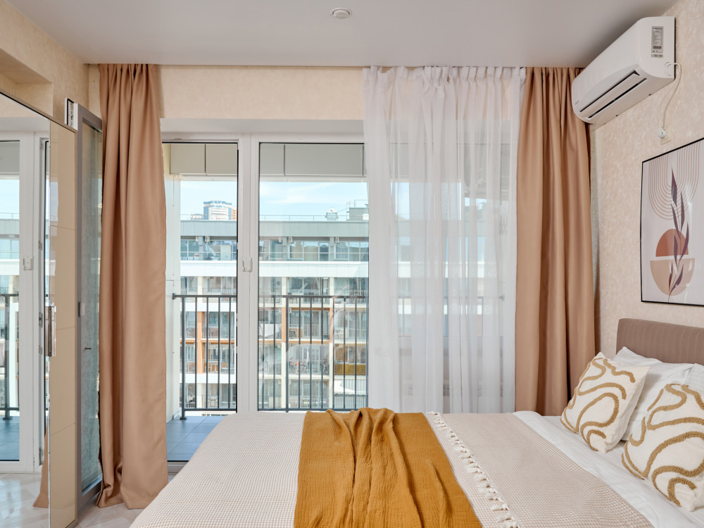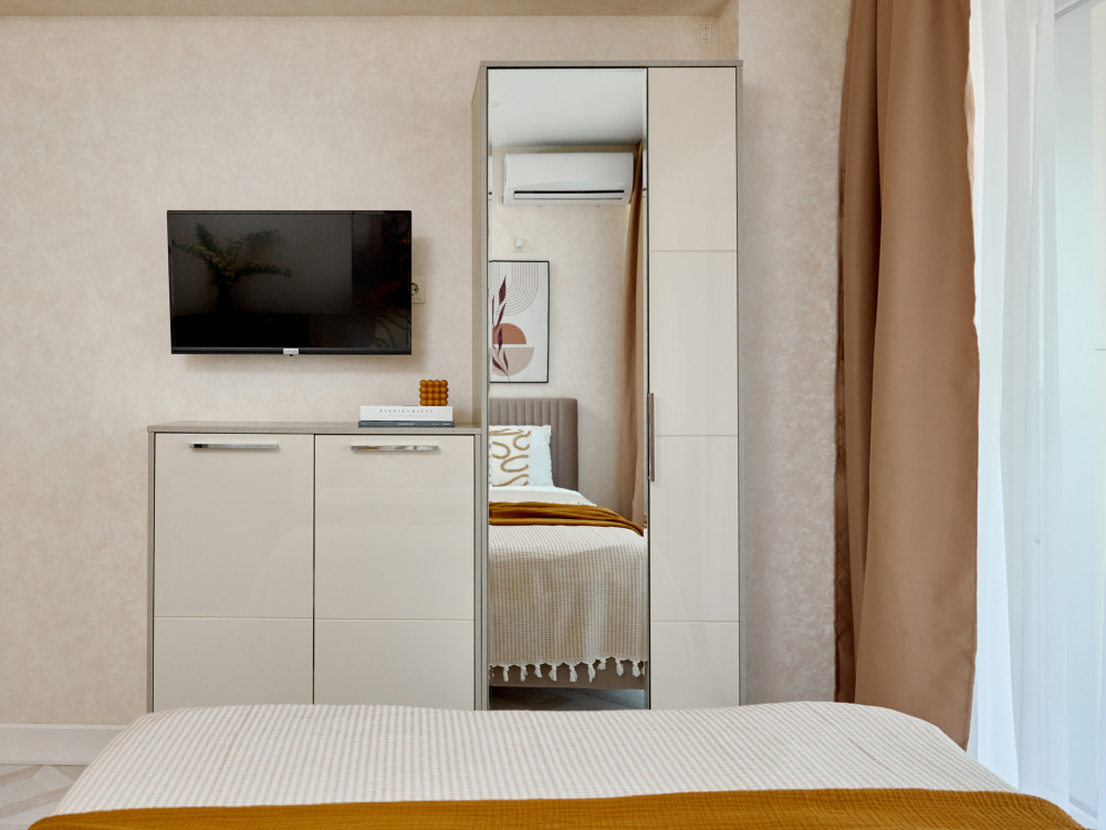 Видовые апартаменты-студия «Chocolate Studio» c евроремонтом, с видом на бассейн и боковым видом на море и горы. В квартире имеется всё необходимое для комфортного проживания семьи из 2-3 человек. Гостям предоставляется доп.место по запросу, телевизор c плocким экpаном, Smаrt Тv и кaбельными канaлами, Wi-Fi, кондиционер, балкон с мебелью. Имеется кухонная зона со всеми принадлежностями. Чайник, микроволновая печь, столовые приборы и посуда, варочная поверхность для самостоятельного приготовления еды, стол и стулья. Санузел оснащен раковиной с зеркалом, душевой кабиной, полотенцесушителем, унитазом и стиральной машиной.