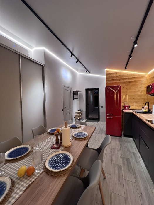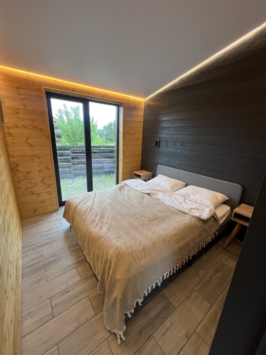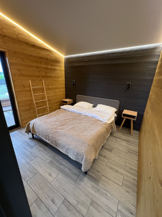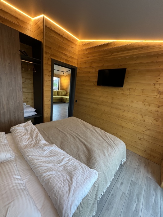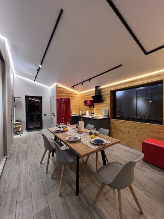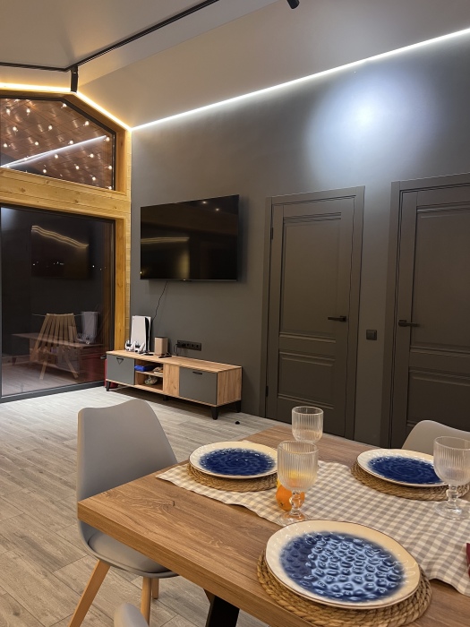 Удобства: полностью оборудованная кухня (холодильник, плита, микроволновая печь, посудомойка, посуда), Wi-Fi, телевизор в каждой комнате, Sony Playstation 5, колонка с Алисой, утюг, фен. Большая парковка, барбекю-зона с мангалом, костровая зона с шезлонгами, терраса с уличной мебелью. Зарядка для электромобилей - Type2 или GBT A/C