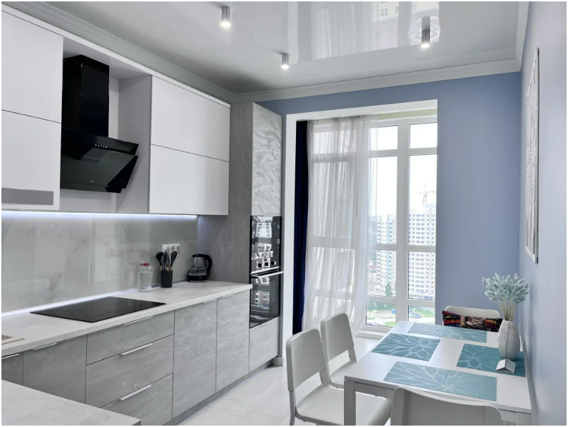 Полная комплектация кухни современной техникой и посудой.