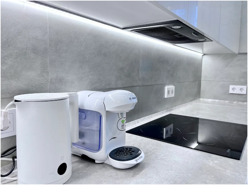 Полная комплектация кухни современной техникой и посудой.