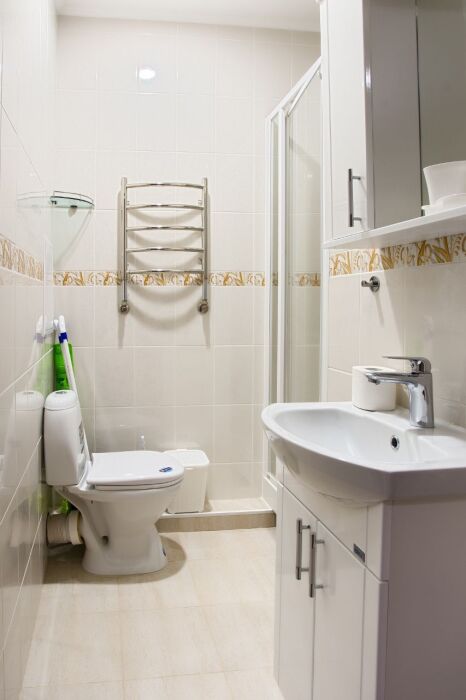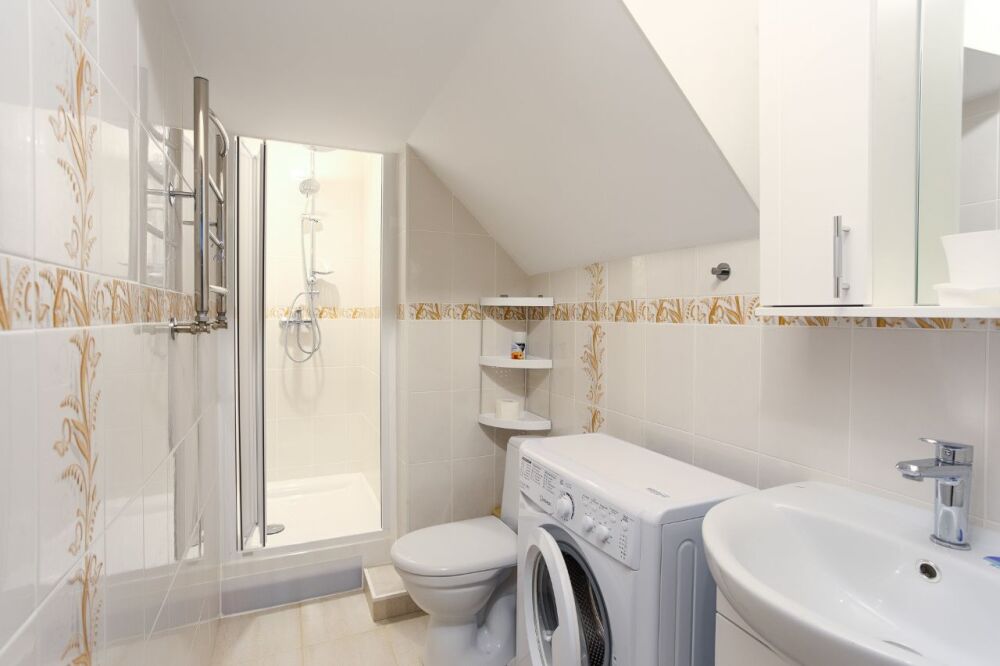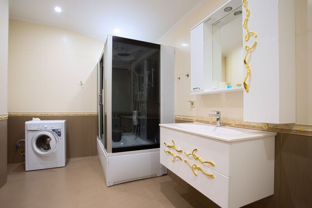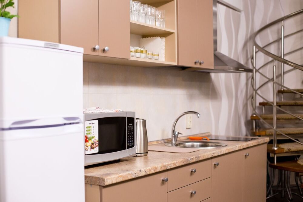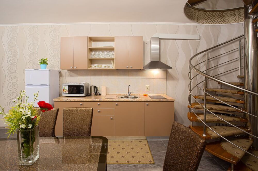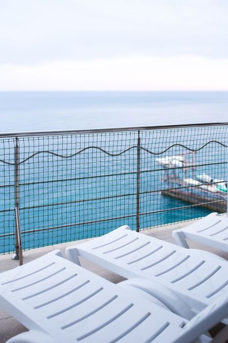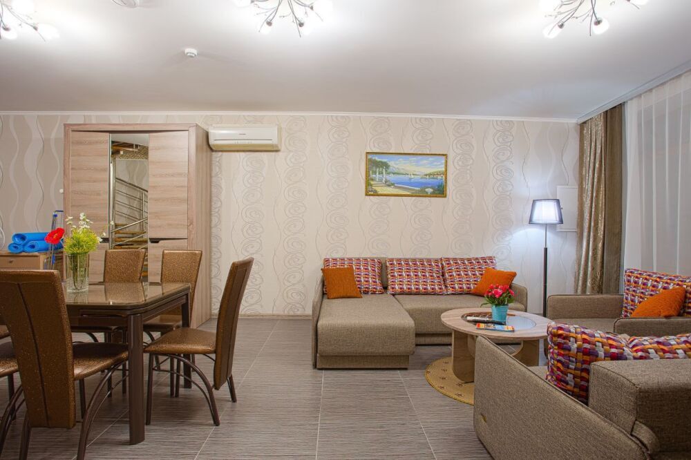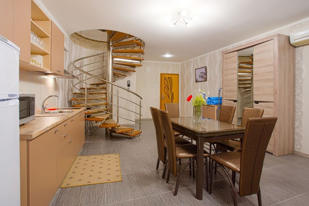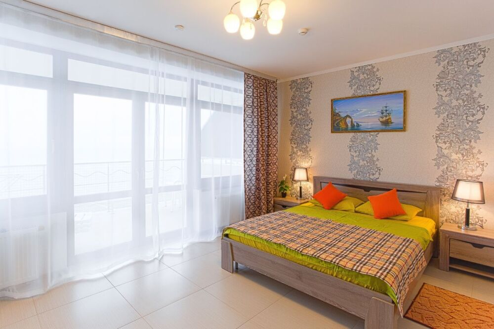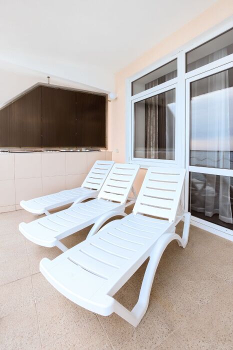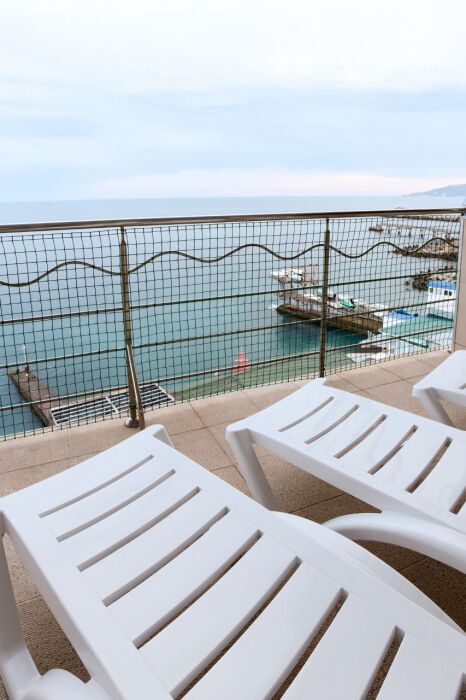 Апартаменты занимают два последних этажа (6 и 7 этажи) Wi-Fi, 2 балкона с видом на море и удобными шезлонгами, 2 телевизора 55 дюймов, кондиционер, холодильник, микроволновая печь, чайник, электроплита, посуда, стиральная машина, утюг и гладильная доска, фен. На первом этаже: оснащенная всей необходимой техникой кухня-гостиная (спальные места: большой двуспальный раскладной диван, 2 односпальных раскладных кресла) и санузел, балкон. На втором этаже: спальня с двуспальной кроватью, санузел, терраса.