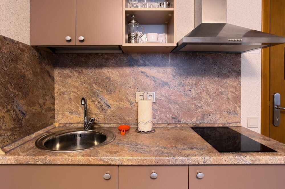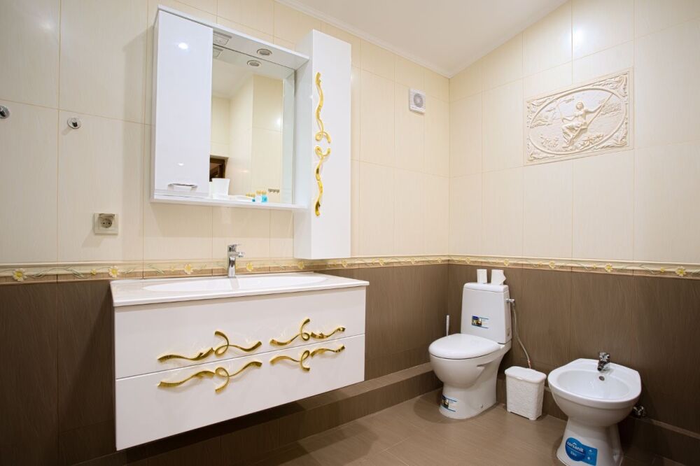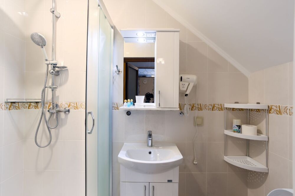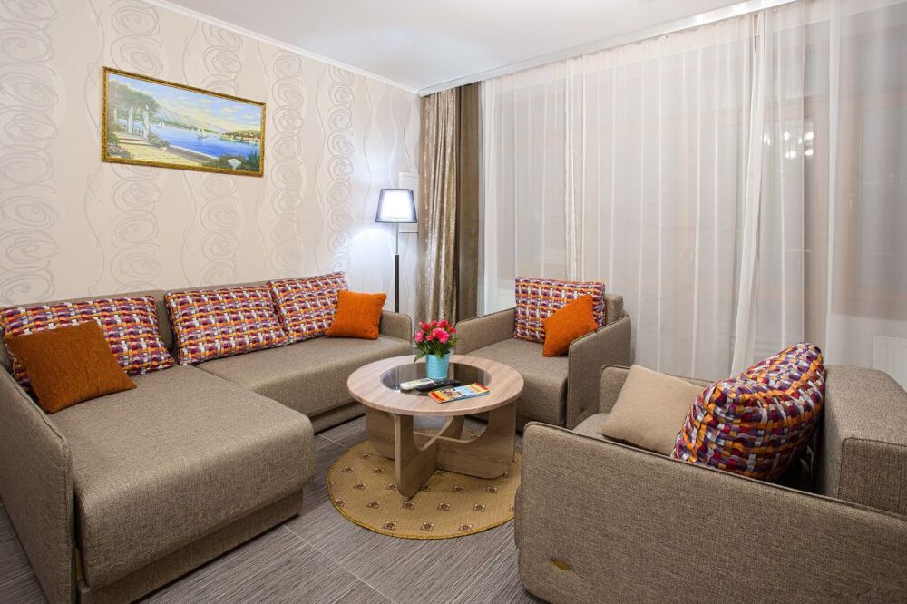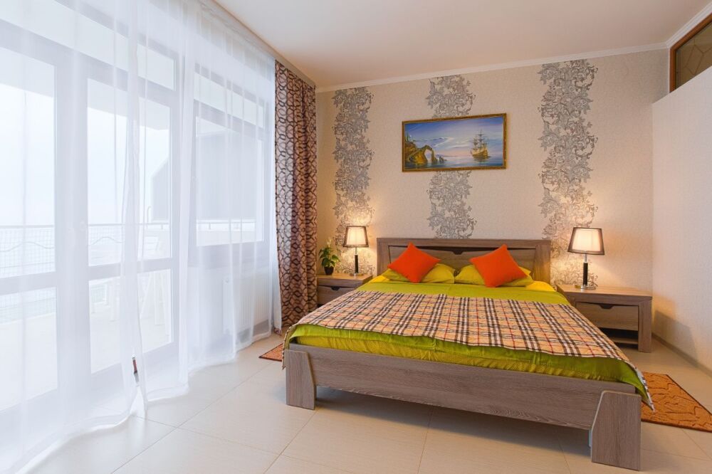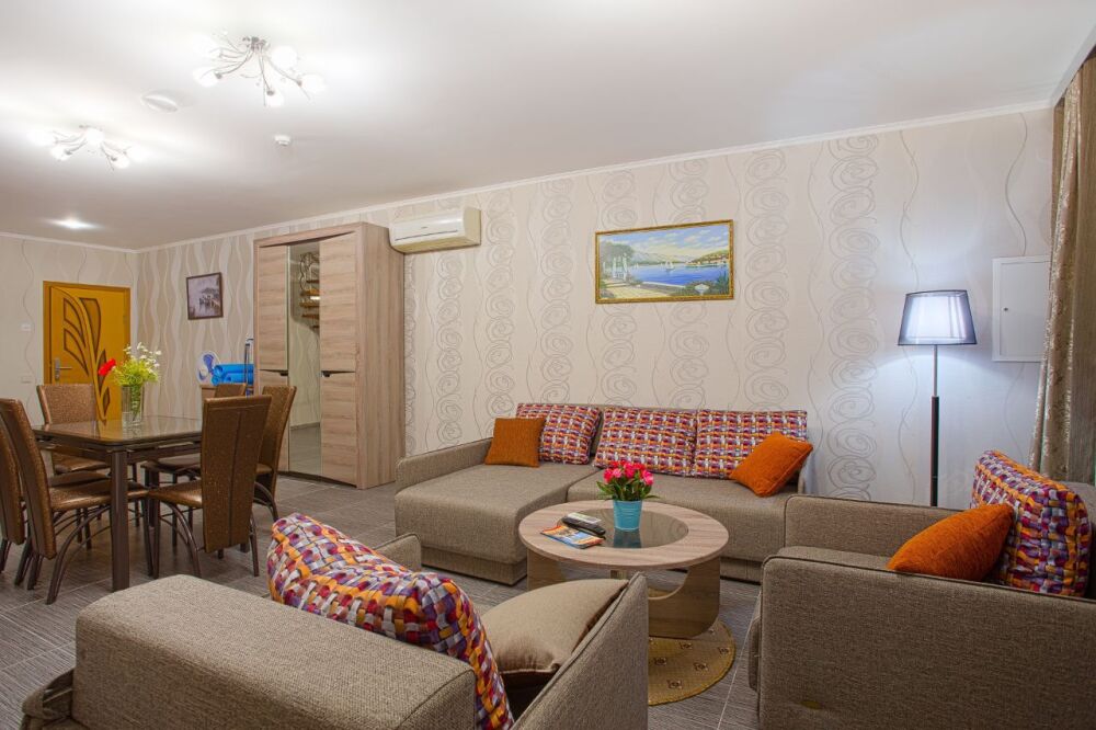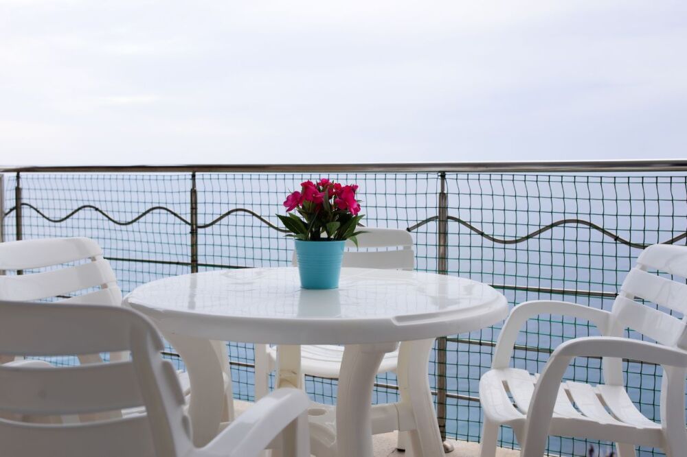 Апартаменты с видом на море находятся на 3-м этаже. Wi-Fi, балкон с видом на море и шезлонгами, телевизор, кондиционер, холодильник, микроволновая печь, чайник, электроплита, посуда, стиральная машина, утюг и гладильная доска, фен. Предоставляем полотенца, постельное белье и средства гигиены. Комната 1: кухня-гостиная (спальные места: раскладной 2-местный диван, односпальная кровать). Комната 2: спальня с двуспальной кроватью. Для детей предоставляем детскую кроватку, стул для кормления и горшок.
