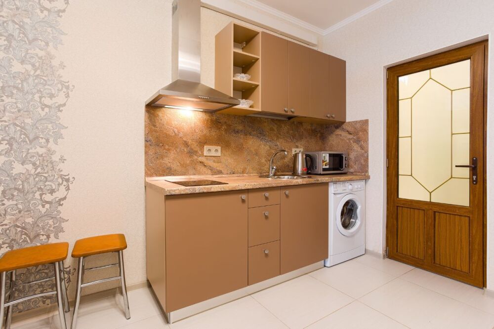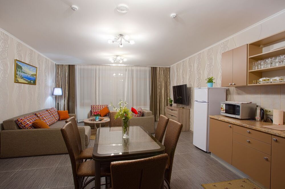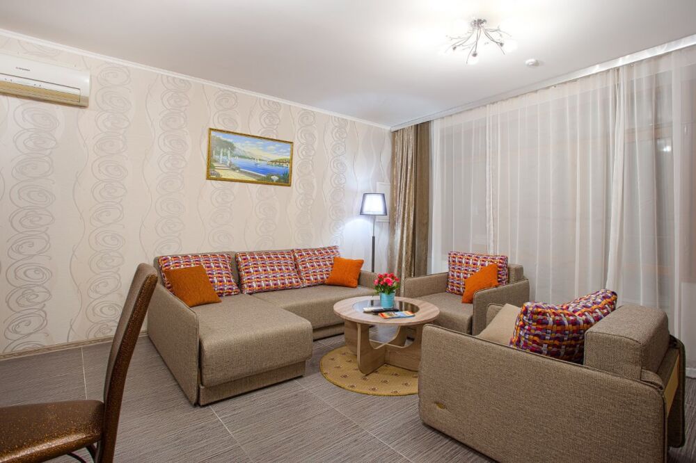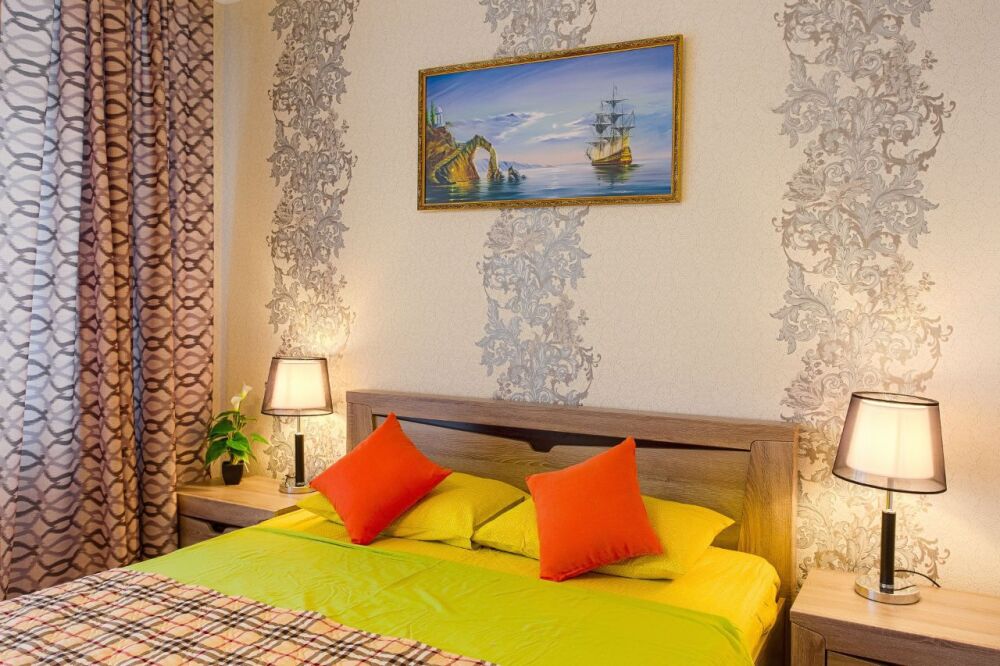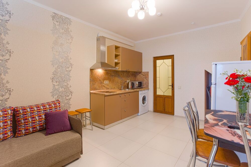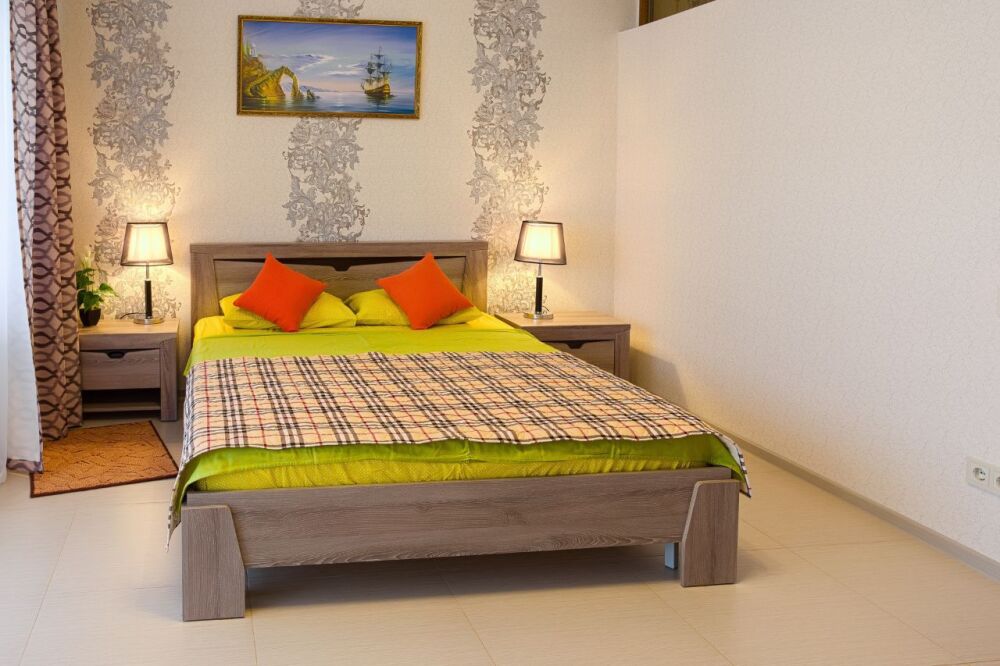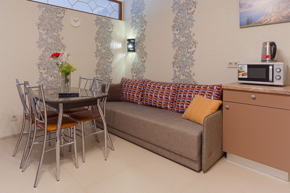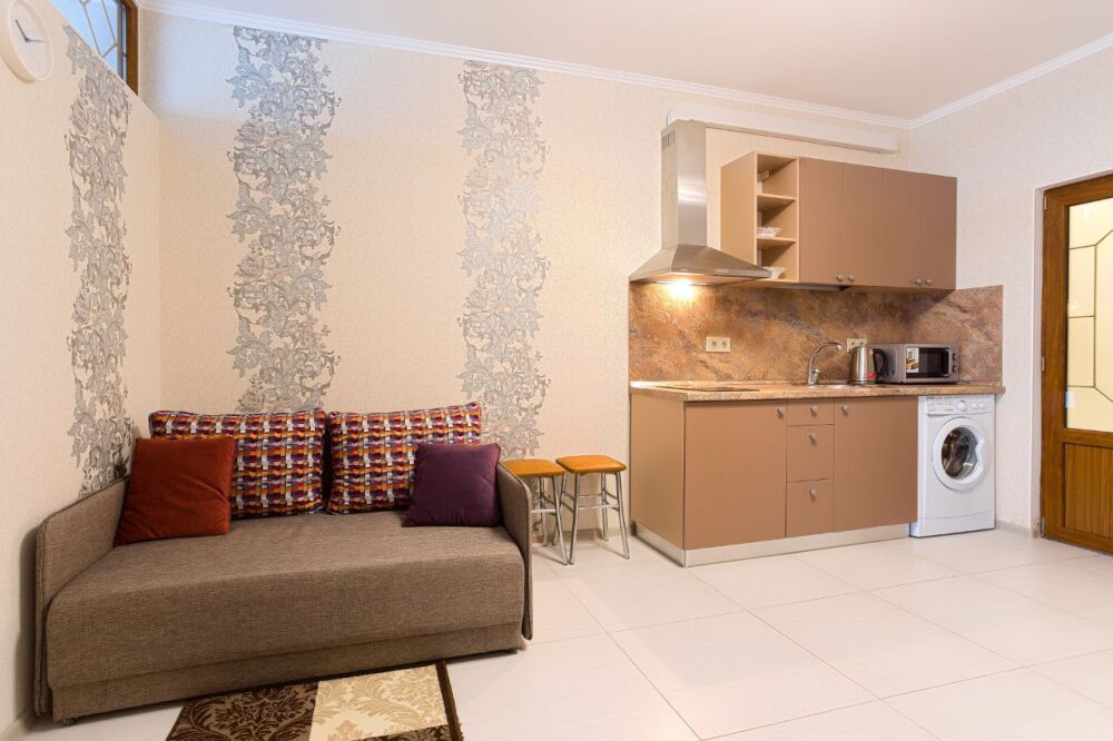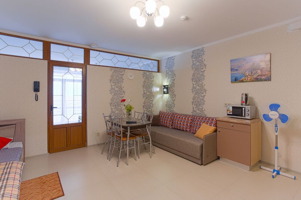 Апартаменты с видом на море находятся на 2-м этаже. Wi-Fi, балкон с видом на море и шезлонгами, телевизор, кондиционер, холодильник, микроволновая печь, чайник, электроплита, посуда, стиральная машина, утюг и гладильная доска, фен. Предоставляем полотенца, постельное белье и средства гигиены. Комната 1: кухня-гостиная (спальные места: раскладной 1-о местный диван). Комната 2: спальня с двуспальной кроватью. Для детей предоставляем детскую кроватку, стул для кормления и горшок. На территории: парковка, мангальная зона.