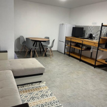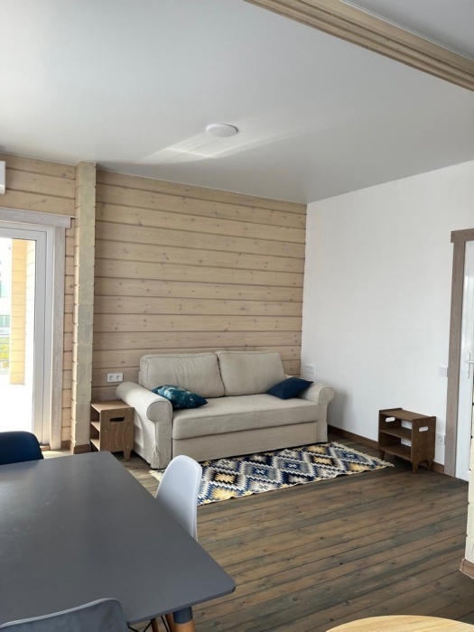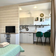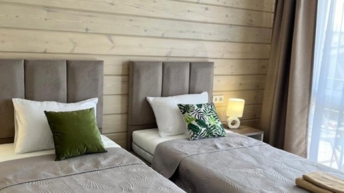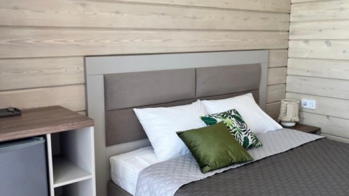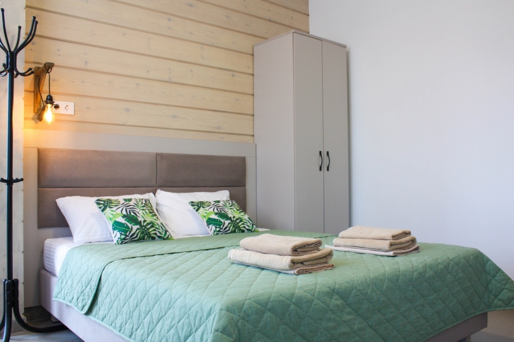 Четырехместный номер с оборудованной кухней и обеденной зоной расположен на первом этаже. Двуспальная кровать с ортопедическим матрасом, двуспальный диван, шкаф, холодильник, кухонная и столовая зона со всем необходимым,телевизор.
