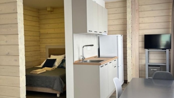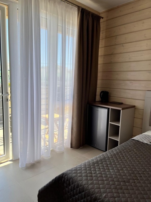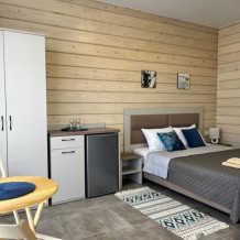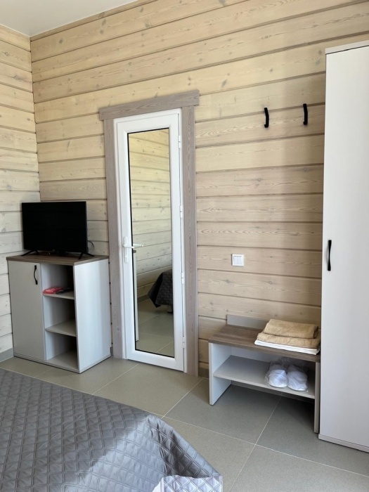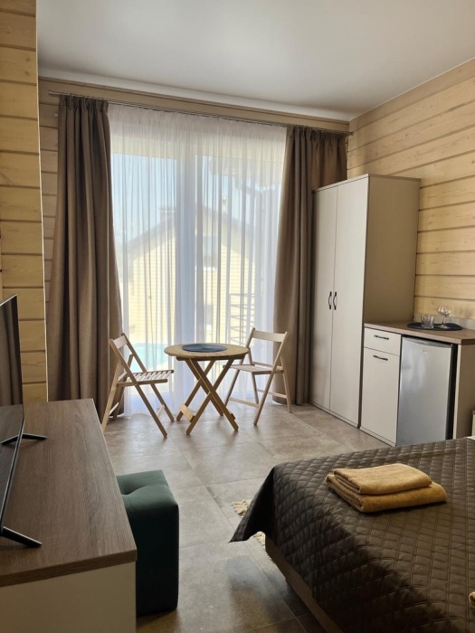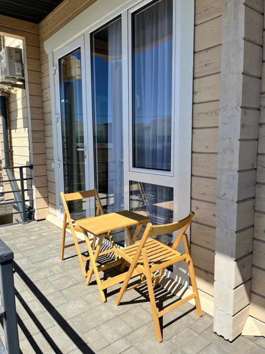 Двухместный номер с оборудованной кухней и обеденной зоной расположен на первом этаже. Небольшая панорамная терраса на входе ,с видом на территорию оборудована комплектом складной мебели из дерева.